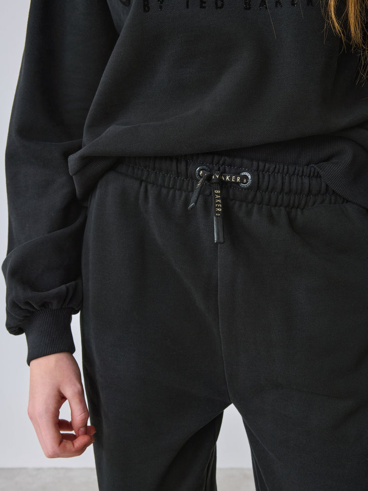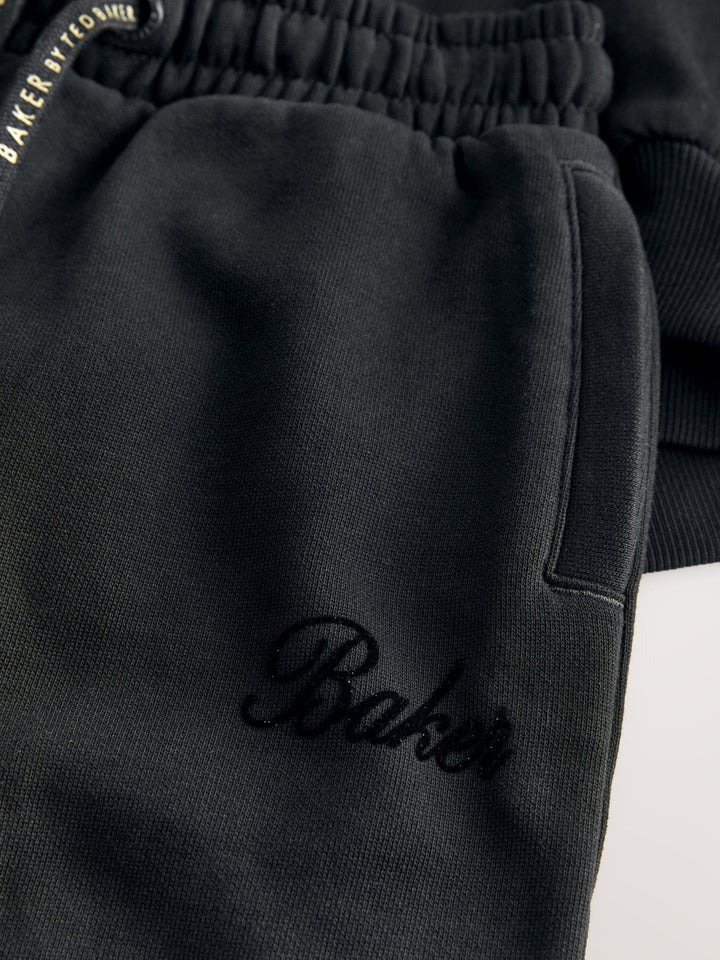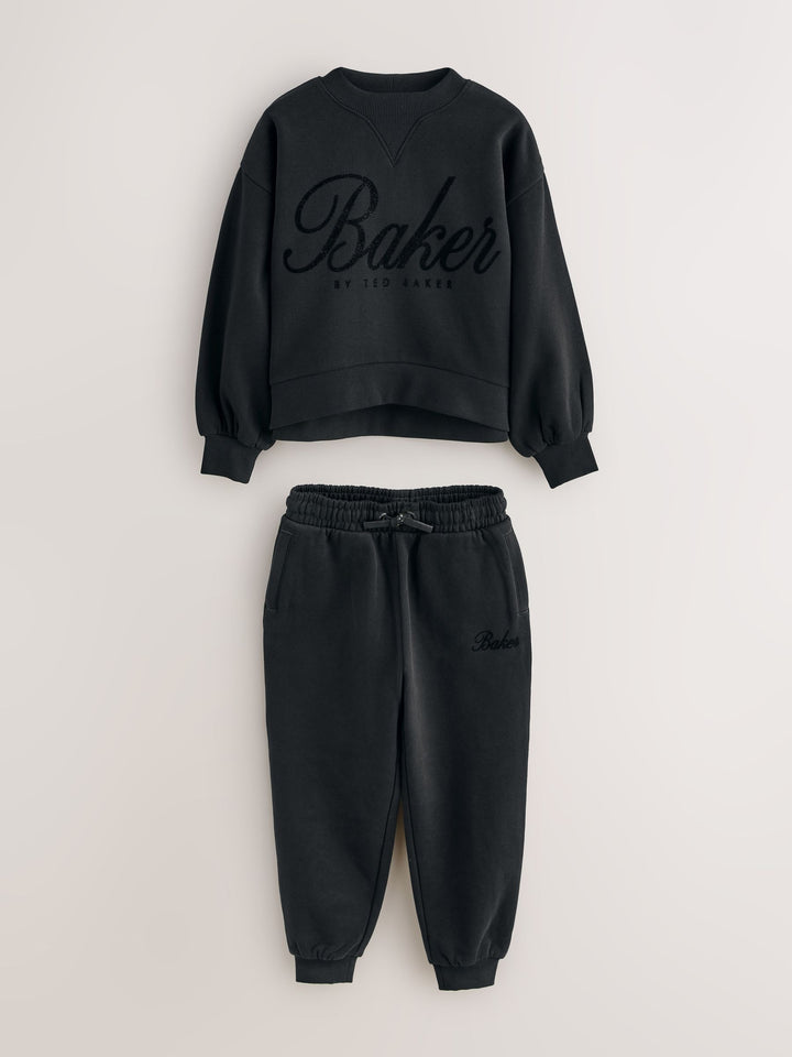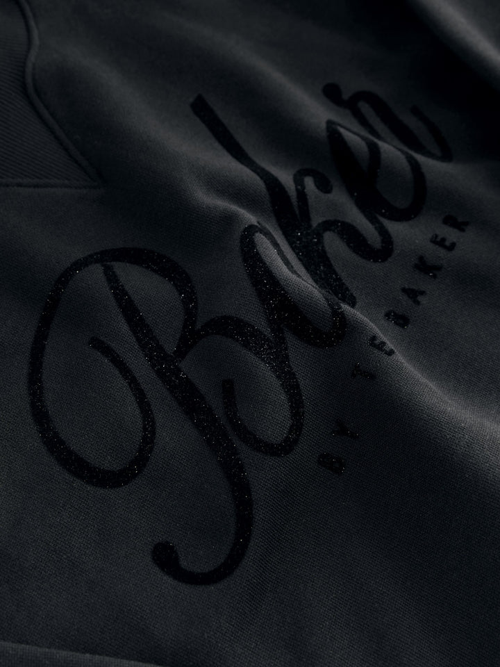 Introducing this essential black oversized tracksuit set from Baker by Ted Baker, a sophisticated update to everyday loungewear. This co-ord combines premium comfort with high-impact branding. Crafted from a soft, brushed fabric, this crew and jogger set comes with ribbed details on the neck and cuffs and glittered flock branding across the chest and leg of the joggers. The oversized cuffed joggers feature functional pockets and branded gold eyelets and drawcords. This oversized cosy set is a versatile staple for any modern wardrobe. 2 piece set Glittered flock branding Gold branded hardware Sweater and Jogger Main 100% Cotton. Rib 95% Cotton, 5% Elastane. Country of Origin: Bangladesh