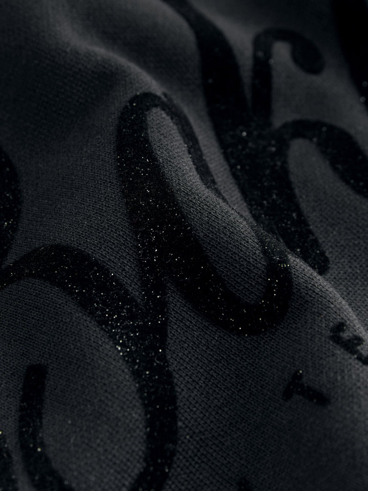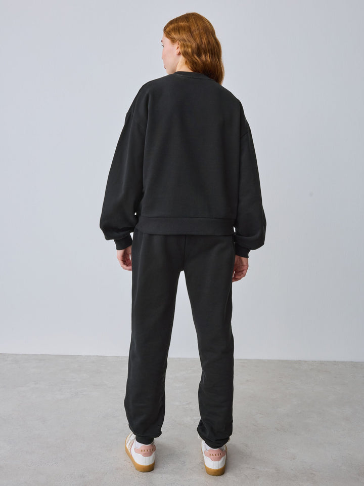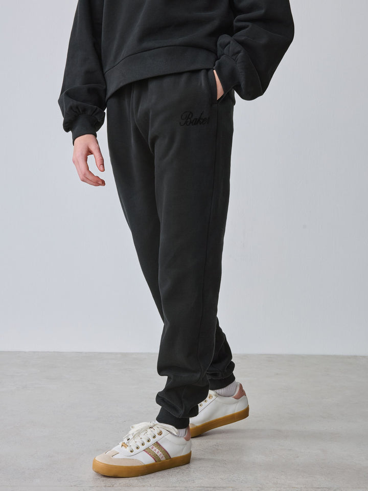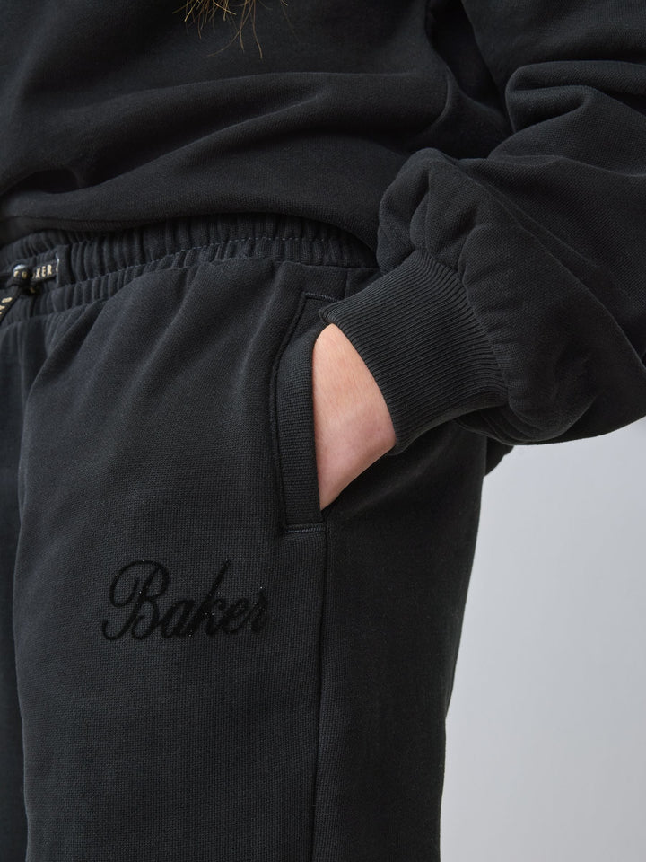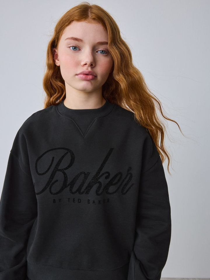 Introducing this essential black oversized tracksuit set from Baker by Ted Baker, a sophisticated update to everyday loungewear. This co-ord combines premium comfort with high-impact branding. Crafted from a soft, brushed fabric, this crew and jogger set comes with ribbed details on the neck and cuffs and glittered flock branding across the chest and leg of the joggers. The oversized cuffed joggers feature functional pockets and branded gold eyelets and drawcords. This oversized cosy set is a versatile staple for any modern wardrobe. 2 piece set Glittered flock branding Gold branded hardware Sweater and Jogger Main 100% Cotton. Rib 95% Cotton, 5% Elastane. Country of Origin: Bangladesh