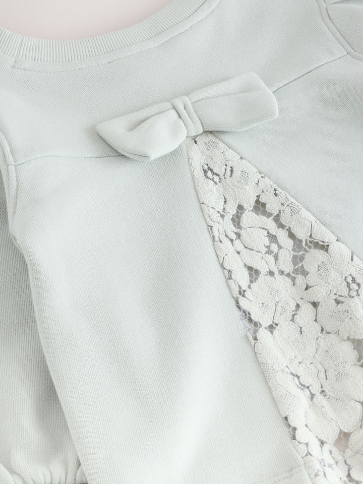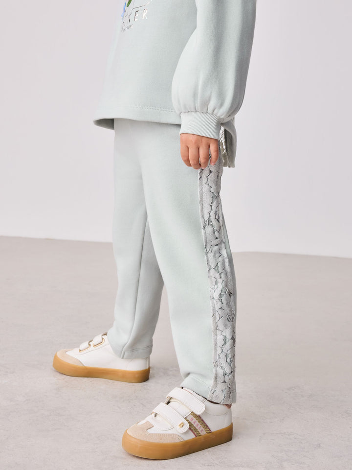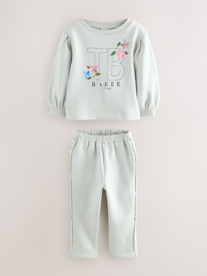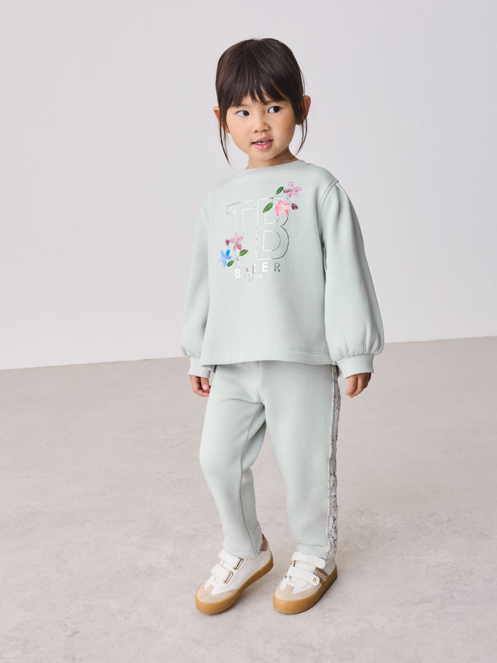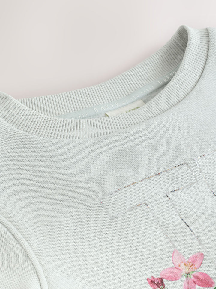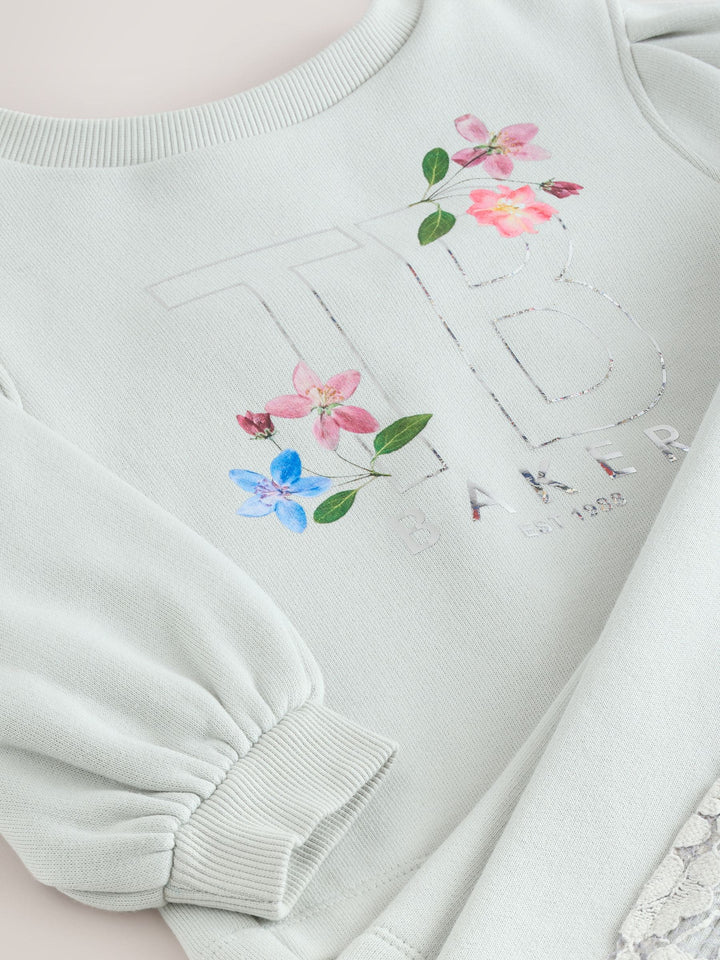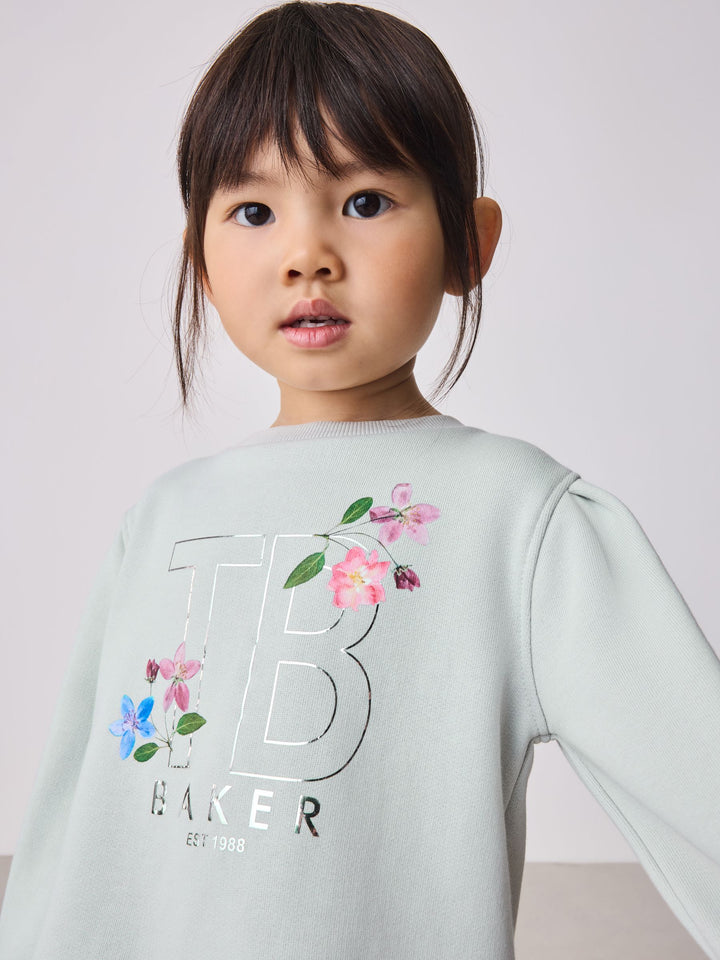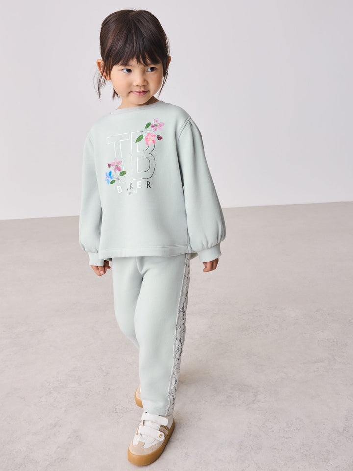 Get her looking cute and stylish in Baker this season, in this pretty lace back sweat and straight leg jogger set from Baker by Ted Baker. This cute piece comes in a soft mint brushback fabric, boasting pretty lace details and foil branding. The sweat features a lace back detail with a 3D bow at the top, complimented with the straight leg joggers, which feature lace panels down either side of the leg. The sweat top features our iconic TB branding in silver foil complimented with pretty soft floral prints. Pair with our Baker trainers for the cutest playtime fit! Sweater Main 60% Cotton, 40% Polyester. Rib 95% Cotton, 5% Elastane. Jogger 60% Cotton, 40% Polyester. Country of Origin: India