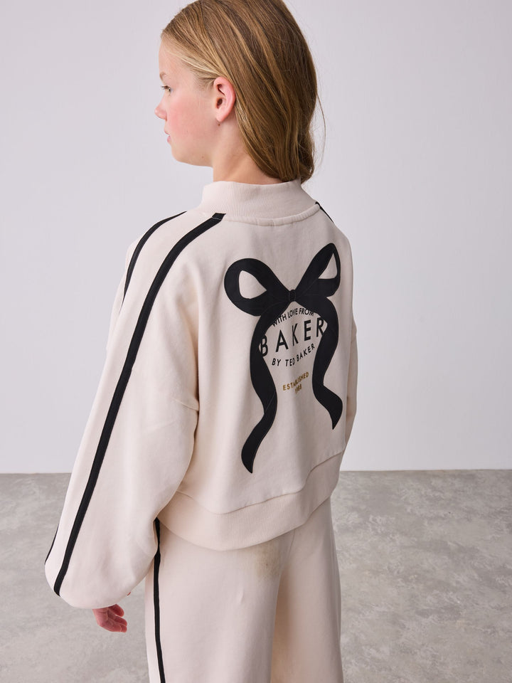 Cool, chic, and ready for autumn, she'll fall in love with this 2 piece set from Baker by Ted Baker. The set includes a soft brushback sweat top with a funnel neck shape and a wide leg jogger, featuring black contrast piping trims down the side of the arms and legs. The sweat top also features black branded poppers, and a large bow placement print on the back, complimented with foil Baker branding. The joggers feature a printed bow on the waist, with our iconic Baker branding below. The joggers also feature functional Baker branded drawcords at the waist, with dipped ends and cream eyelets to match. Perfect for chilly days out ahead. 2 piece set Branded Baker buttons Baker printed branding Sweater and Jogger 100% Cotton. Country of Origin: Bangladesh