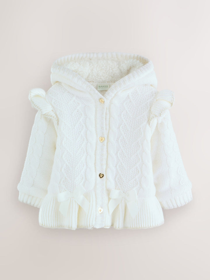 Dress your little one in this adorable knitted coatigan from Baker by Ted Baker. This cute staple piece comes in a soft knitted fabric, with soft borg fleece lining and gold trims. The coatigan features little bows on the front, with a soft fleece hood and Baker heart branded buttons. This is the perfect layering piece for your little girl. Warm fleece lining Knitted bow details Baker branded buttons Main 100% Acrylic. Lining 100% Polyester. Country of Origin: China