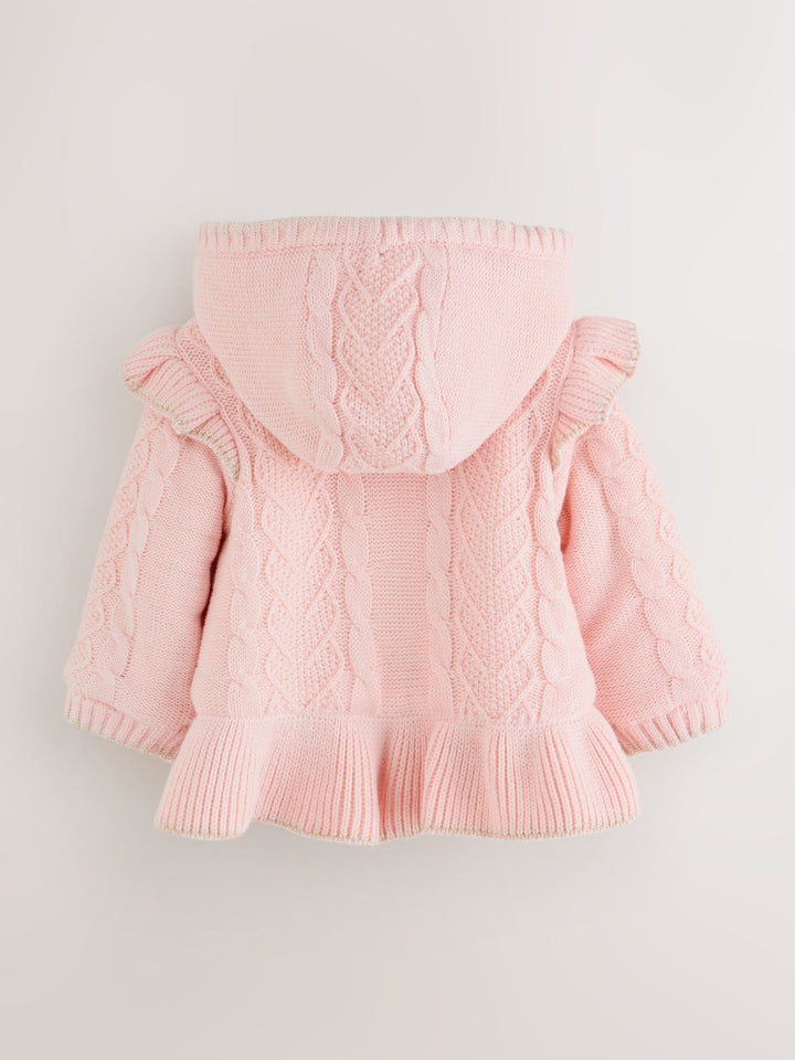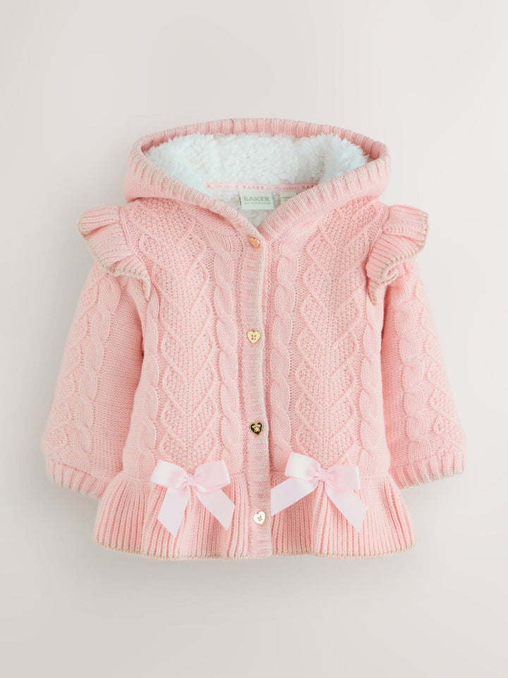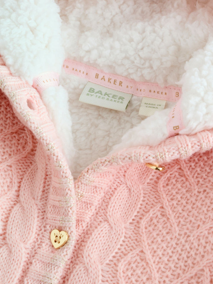 Dress your little one in this adorable pink knitted coatigan from Baker by Ted Baker. This cute staple piece comes in a soft knitted fabric, with soft borg fleece lining and gold trims. The coatigan features little bows on the front, with a soft fleece hood and Baker heart branded buttons. This is the perfect layering piece for your little girl. Warm fleece lining Knitted bow details Baker branded buttons Main 100% Acrylic. Lining 100% Polyester. Country of Origin: China