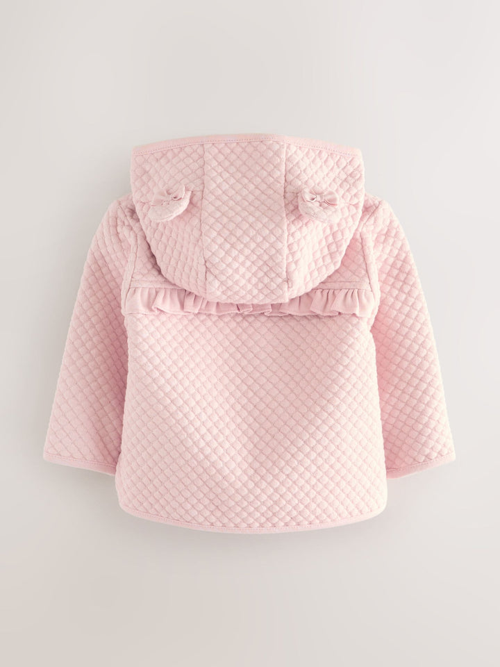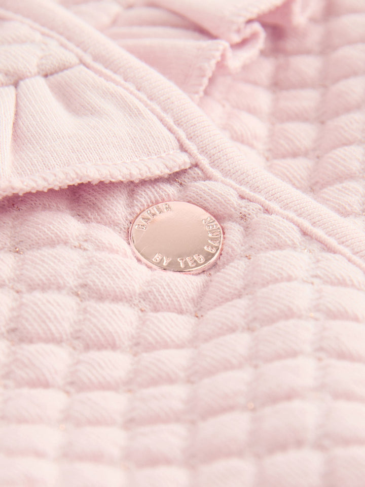 Your little one will look cute and cosy in this quilted hooded jacket from Baker by Ted Baker. This hooded jacket with ears comes in a quilted design in an all over glittered fabric. The layering piece also includes a quilted hood with ears and a gorgeous floral printed lining, not to mention adorable grosgrain bows at the ears. Details include a frill at the yoke seam going from the front to the back, bow shaped pockets and gold Baker branded poppers. The cutest cosy piece your little one will adore. Quilted fabric Lined hood Frill detail Cute and cosy Main 49% Cotton, 47% Polyester, 3% Metallised fibre, 1% Elastane. Lining 100% Cotton. Country of Origin: China