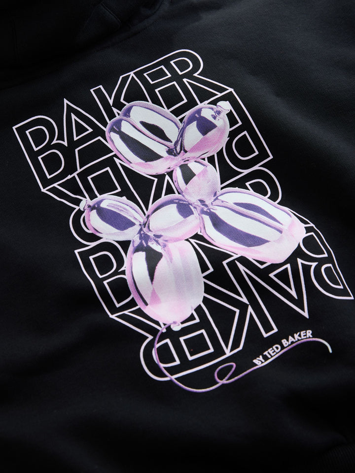 Bring a pop of colour to her casual wear with this BAKER by Ted Baker hoodie. Designed for both comfort and standout style, this hoodie features a soft, brushback fabric and a modern oversized fit perfect for layering. The front is detailed with bold bubble branding, incorporating a shiny 3D balloon-effect initial to catch the eye, whilst the large back print is a striking metallic balloon dog graphic set against an outlined 'BAKER' text. This hoodie is the perfect blend of stylish and signature Ted Baker charm. 80% Cotton, 20% Polyester. Country of Origin: Turkey