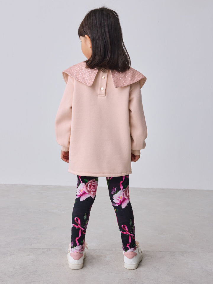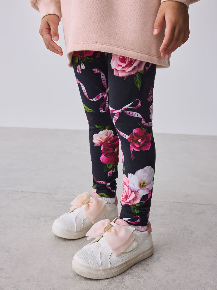 Boasting playful sophistication with this two-piece set from Baker by Ted Baker. This co-ord blends cute comfort with irresistible statement details. The sweat top comes in a soft brushed fabric in a delicate pale pink shade, boasting a unique, large statement collar in the shape of an oversized bow, which is beautifully finished in shimmering pale pink sequins. Details include foil Baker branding on the chest, whilst the back features rose gold poppers on the placket. Perfectly paired with eye-catching floral legging that feature a vivid all-over floral and ribbon print on a navy base. With a comfortable elasticated waist, this set offers a dazzling, coordinated look that's perfect for parties or elevated playdates! Sweater 55% Cotton, 45% Polyester. Leggings 95% Cotton, 5% Elastane. Country of Origin: United Arab Emirates
