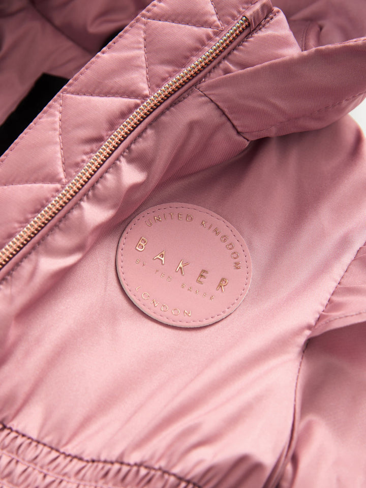 Banish those rainy days in style with this fashionable and functional rain coat from Baker by Ted Baker. The shiny pink raincoat cuts a stunning silhouette with a layered scallop style hem, frilled details on the shoulders and a ruched waist for a comfortable fit. The raincoat boasts beautiful rose gold hardware including both zip and popper fastenings, with printed rose gold branding on the hood and a branded Baker badge at the chest. Perfectly lightweight yet effective against the shower season. Shower resistant Scallop hem Rose gold branded hardware Shell 100% Nylon. Body Lining 100% Cotton. Sleeve Lining 100% Polyester. Wadding 100% Polyester. Country of Origin: China Shower resistant, water repellent finish to provide protection against light rain.