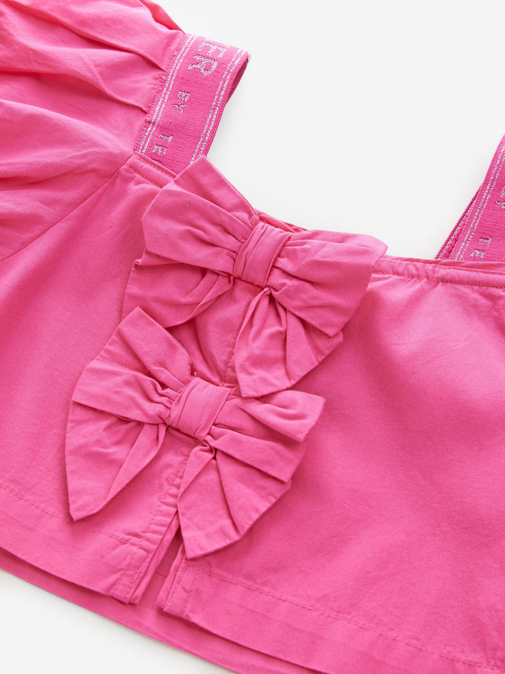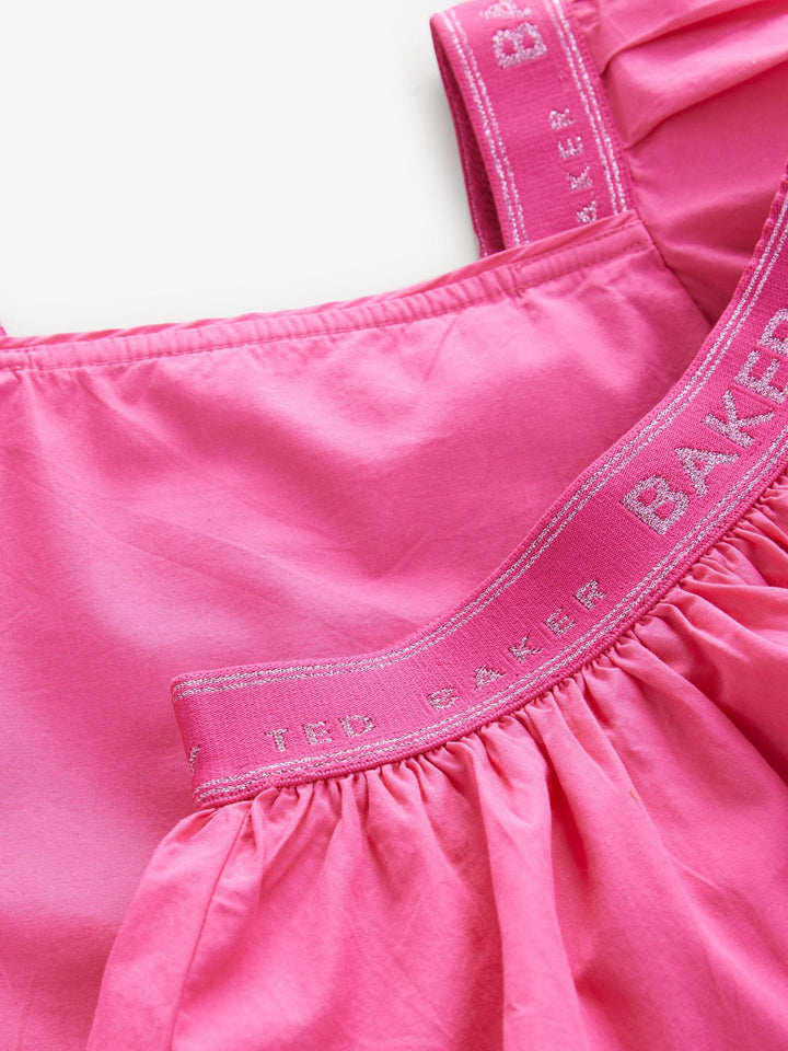 Ready for summer with this pretty pink woven set from Baker by Ted Baker. This 2 piece features a woven top in a gorgeous pink colour, with bows at the back, pink elastic straps, and exaggerated puff sleeves. The 2-tier skirt comes with an adjustable pink waistband, with a pretty picot trim at the hems. Pair with her favourite summer sandals for the ideal summer outfit! T-shirt Main 100% Cotton. Sleeve Lining 100% Cotton. Skirt Skirt 100% Cotton. Skirt Lining 100% Cotton. Country of Origin: India