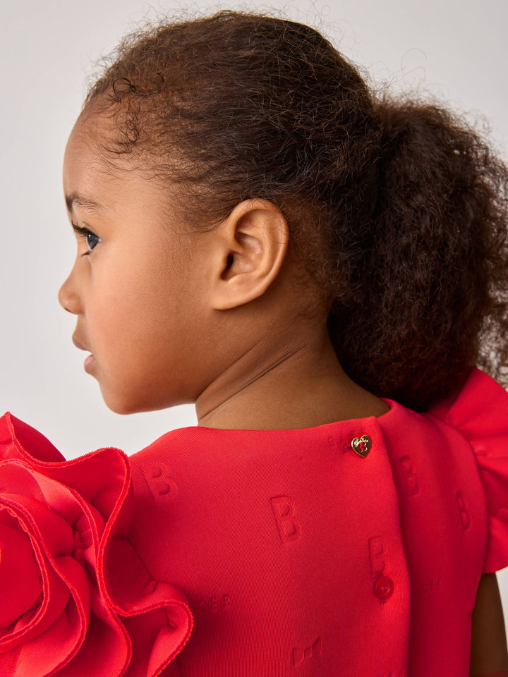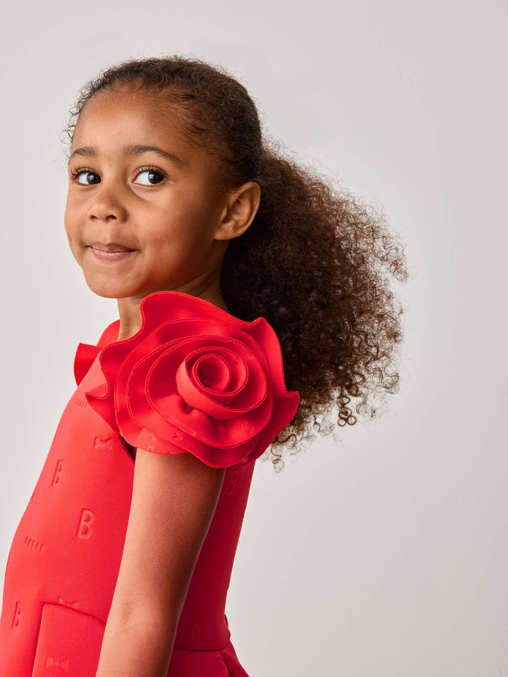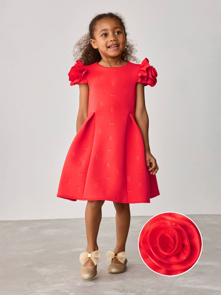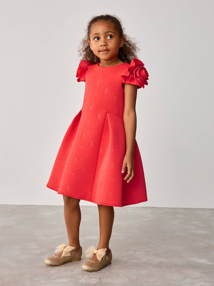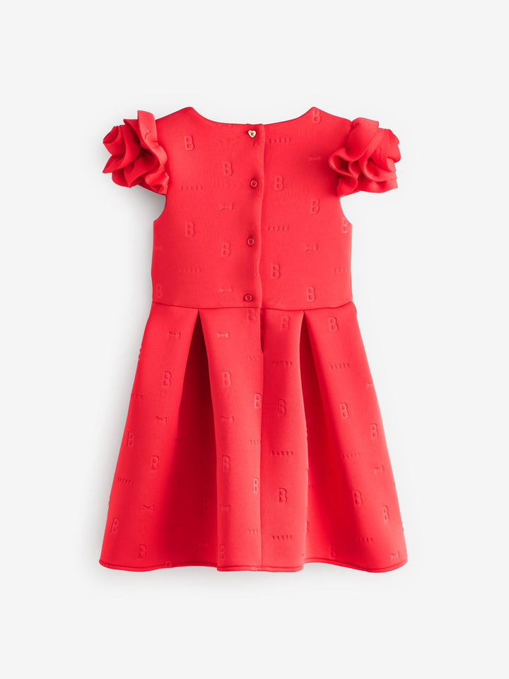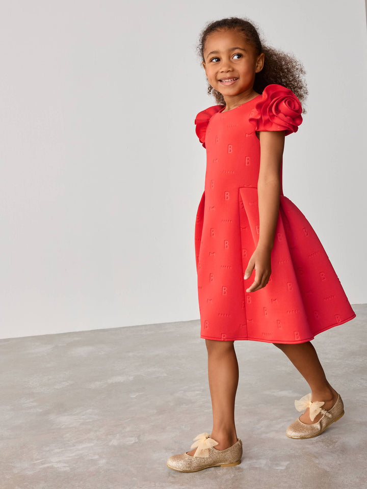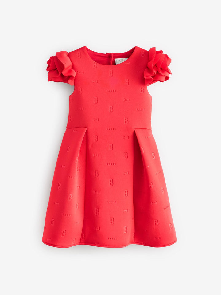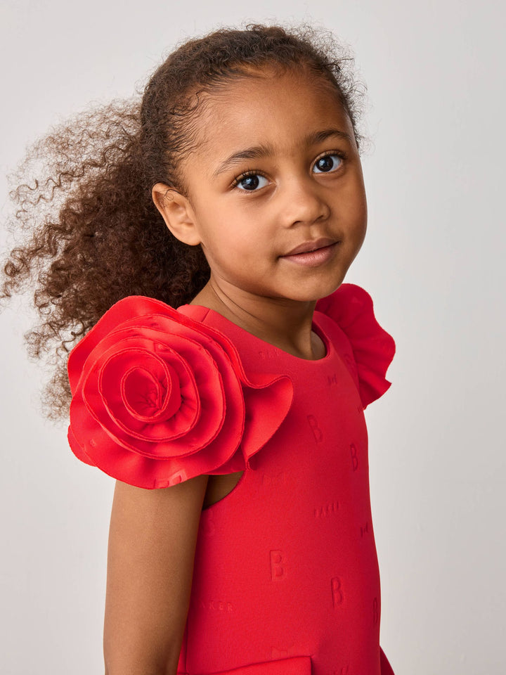 Get her ready for occasion season with this rose sleeve embossed scuba dress from Baker by Ted Baker. This dress comes in a soft scuba fabric with our iconic Baker embossed branding. Featuring a unique 3D rose sleeve design, with structured shaping around the waist. For closure, the dress includes heart shaped branded Baker buttons, with the top button being in a pale gold. This stunning red colour is perfect for the upcoming spring season, your little one will adore this piece. Main 92% Polyester, 8% Elastane. Lining 100% Polyester. Country of Origin: Morocco