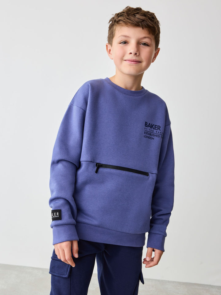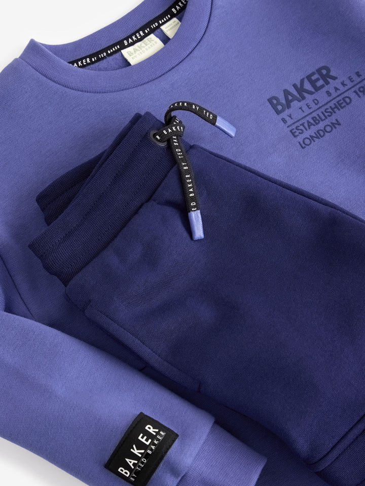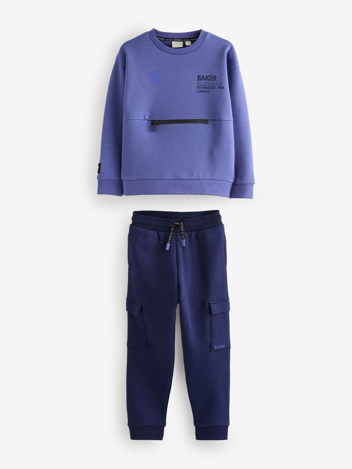 Blue Sweatshirt and Navy cargo Joggers set, Navy printed branding on the chestpocket on the front with branded zip puller. Baker badge on wrist of sleeve. Large print on back, matching the chest brandingcargo joggers with branded drawcords and cargo pockets with navy branding on one pocket Sweater and Jogger Main 78% Cotton, 22% Polyester. Rib 99% Cotton, 1% Elastane. Country of Origin: Pakistan