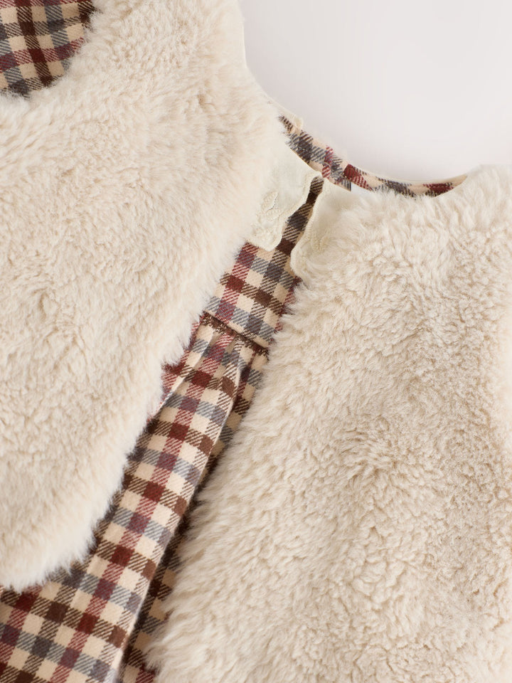 Dress your little one in this charming two-piece set, perfect for a cosy and stylish look. The soft gingham check dress features a pretty broderie collar, while the faux-fur waistcoat adds an extra layer of warmth and texture. It's an ideal outfit for cooler days. Two-piece set Gingham check dress Broderie collar Faux-fur waistcoat Button fastening on dress Round neckline on waistcoat Machine washable. Dress 100% Cotton. Gilet Artificial Fur 100% Polyester. Lining 100% Cotton. Country of Origin: India Warning: Keep away from fire and flames.