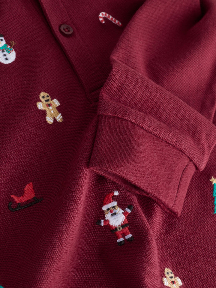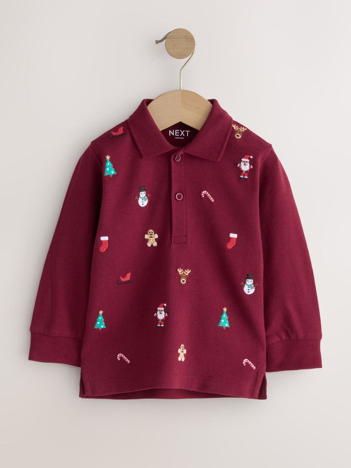 Berry Red Christmas All-Over Embroidered Long Sleeve Polo Shirt (3mths-7yrs)