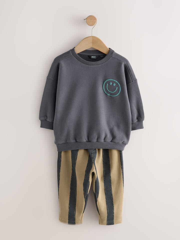 Our sweatshirt and stripes joggers set was made for having effortless styling. This two-piece set is made from breathable cotton and features a black sweatshirt and stripey printed joggers. Perfect for his outdoor adventures, add this to his rotation for a seamlessly stylish look. Two piece set 100% Cotton Sweatshirt with a smiley face Elasticated joggers Pockets Machine washable. Sweater 93% Cotton, 7% Recycled polyester. Jogger 100% Cotton. Country of Origin: Pakistan