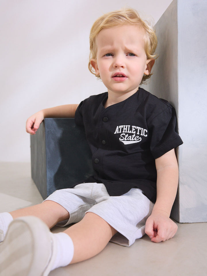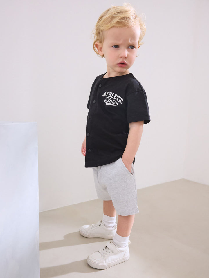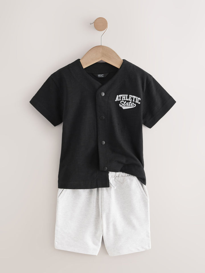 Add a sporty touch to his look with this black/grey baseball inspired shirt and short set. This two piece set includes a jersey button-down top and grey shorts with an elasticated waistband. 2 piece set Baseball design Short sleeve top Elasticated shorts Machine washable. Shirt and Shorts 100% Cotton. Country of Origin: India