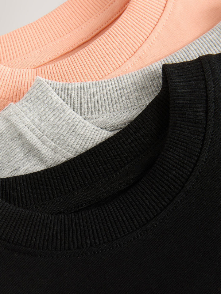 Machine washable. T-shirt Black and T-shirt Coral 100% Cotton. T-shirt Grey Marl 95% Cotton, 5% Viscose. Country of Origin: Bangladesh