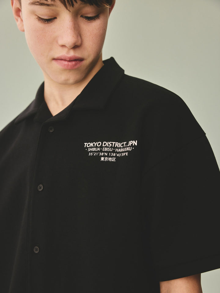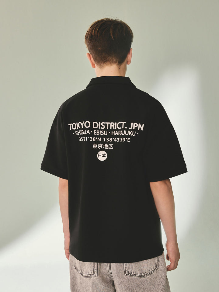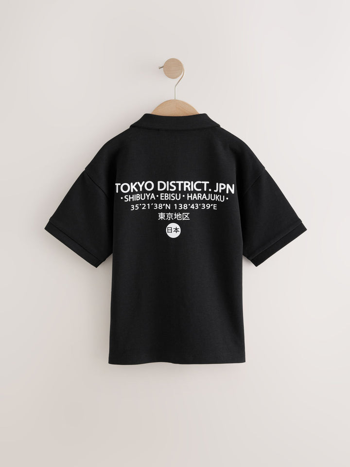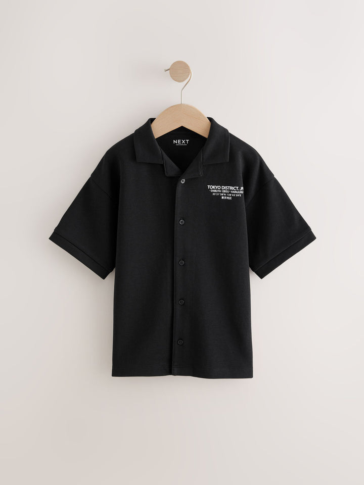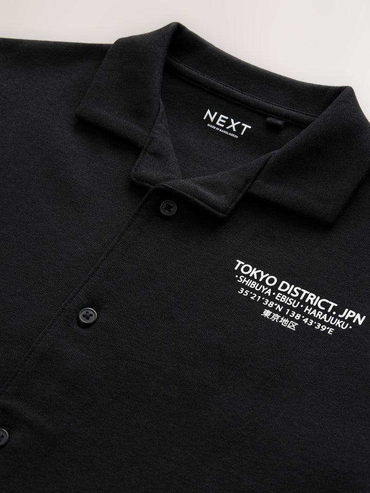 Our black short sleeve shirt is made from a cotton rich blend with a heavyweight jersey feel. Boasting a front and back Japan graphic print, it's complete with button-down fastening, short sleeves and a revere collar. Cotton rich blend Graphic print design Button-through fastening Revere collar Machine washable. 85% Cotton, 15% Recycled polyester. Country of Origin: Bangladesh