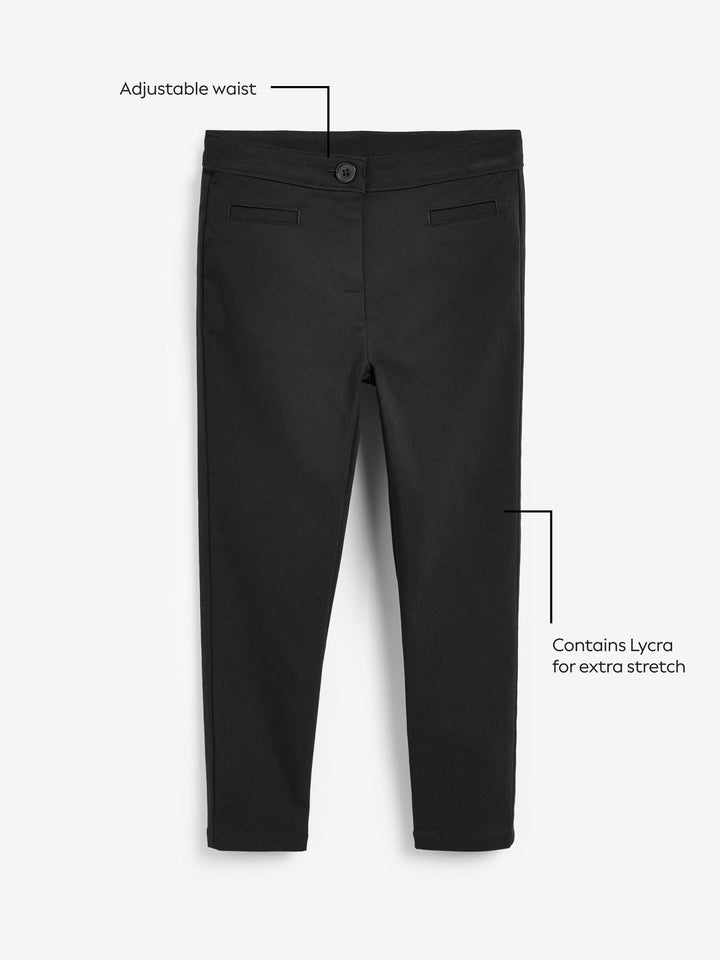 Made from a super-stretchy Lycra®-blend fabric, these black skinny school trousers are perfect to keep her comfortable throughout the day. With an adjustable waist and a zip fly and button fastening for a secure fit, these bottoms are designed in a standard skinny fit. Key Features Adjustable waist Skinny fit Lycra stretch fabric Zip fly and button fastening Pockets Machine washable. 77% Viscose, 20% Nylon, 3% Lycra® Elastane. Country of Origin: Sri Lanka
