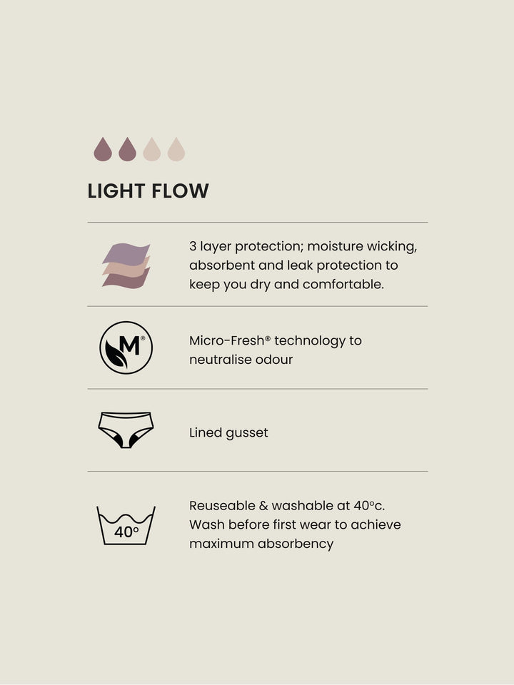 Our 2 pack of teen light flow period shorts offer comfort and confidence for your little lady. These supersoft light flow period pants can be used on their own or as part of your usual routine, keeping you dry and comfortable. They feature a discreet built-in protection for light flow days. Light to moderate flow Our period underwear has a specially designed built-in-lining which absorbs and provides leak proof protection 3 layer technology: moisture wicking & odor neutralising, absorbent layer, and leak protection layer Look and feel like regular underwear - comfortable and discreet fit Washable and reusable We recommend washing before the first time you wear to help activate the technology in the gusset Machine washable. 2 x Shorts 95% Cotton, 5% Elastane. Country of Origin: China