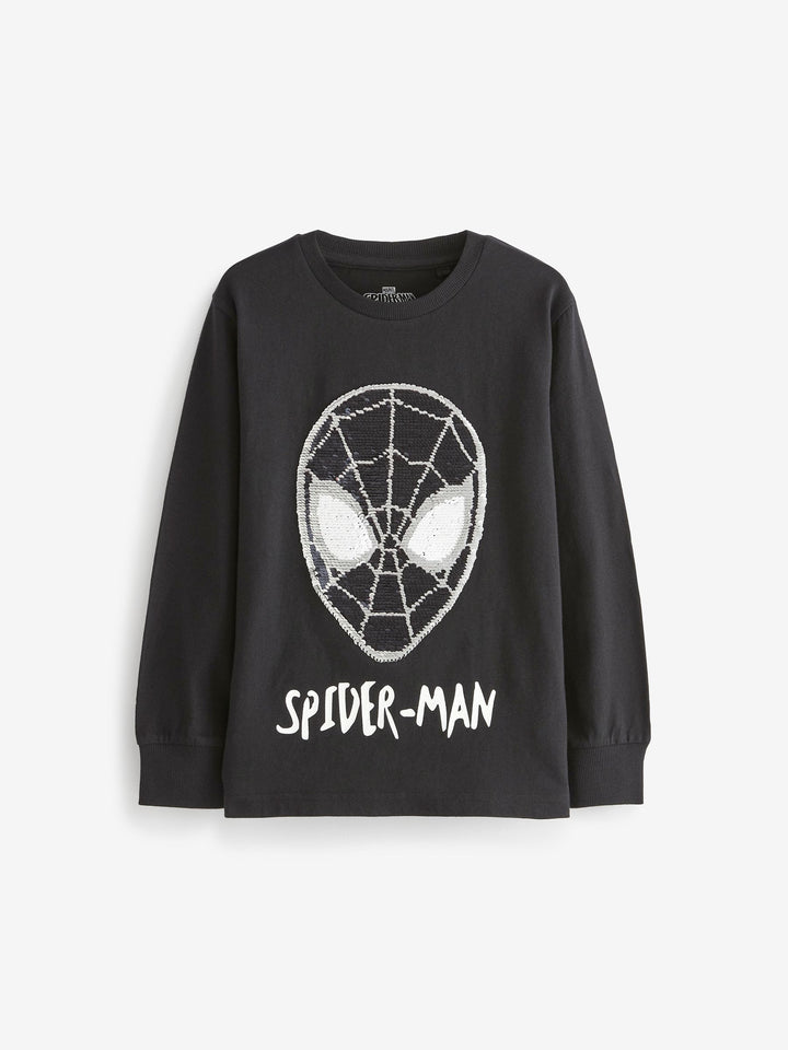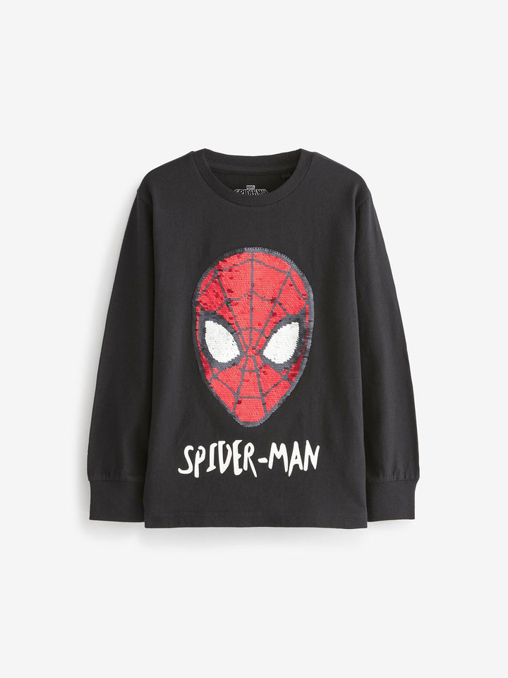Add some superhero style to their rotation with this Spiderman black long sleeve T-Shirt. Featuring an officially licensed flippy sequin design, this pure cotton top is complete with long sleeves, ribbed hems and a crew neckline. Spiderman sequin design Long sleeves Crew neckline Machine washable. 100% Cotton. Country of Origin: India
