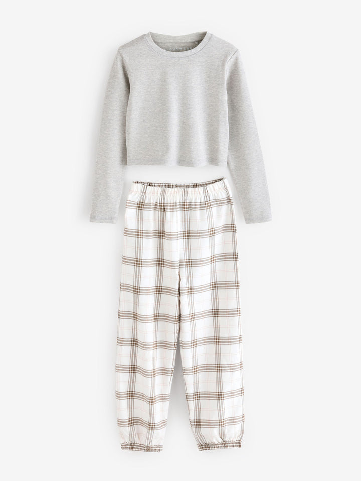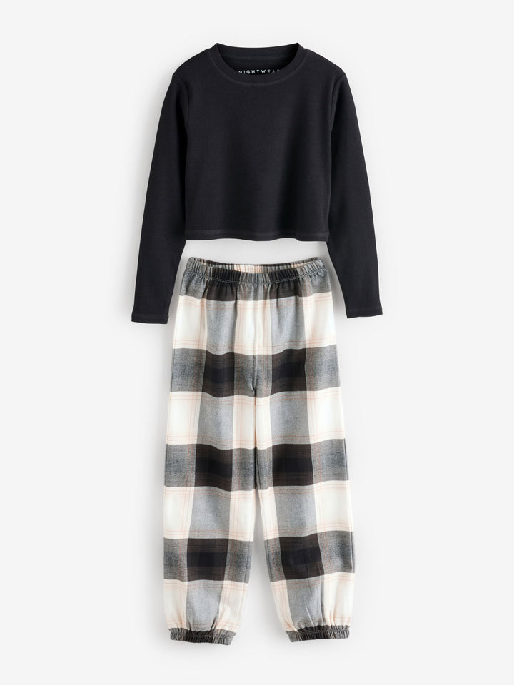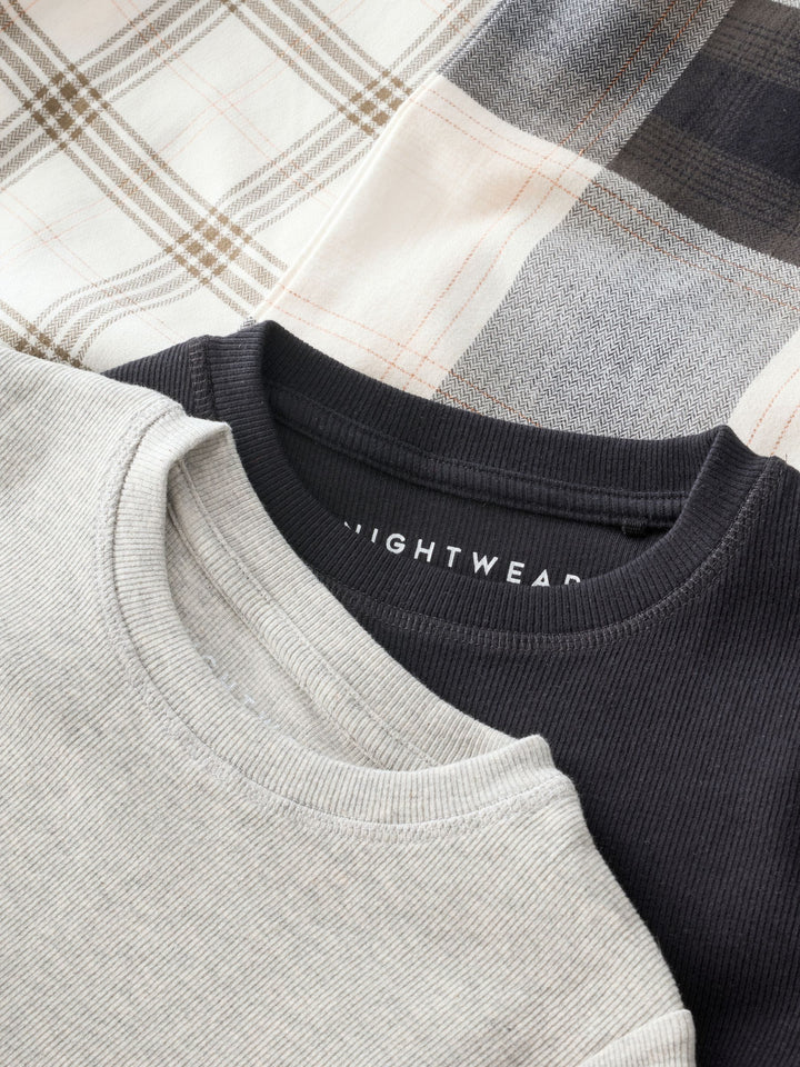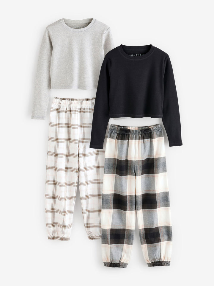 Make her bedtime cosy with this stylish pyjama set. The soft rib top and comfortable woven bottoms ensure a snug fit for all-night wear. The set includes two pairs of woven bottoms in contrasting stripe and check patterns, and even comes with matching scrunchie hair ties to complete her sleepwear look. Soft rib top Comes with scrunchie hair ties Woven pyjama bottoms Stripe and check designs Long sleeves Crew neckline 2 pack Machine washable. Pyjama Top 95% Cotton, 5% Elastane. Pyjama Top 90% Cotton, 5% Elastane, 5% Viscose. 2 x Pyjama Bottom 98% Cotton, 1% Polyester, 1% Metallised fibre. Country of Origin: Bangladesh Warning: Keep away from fire and flames.
