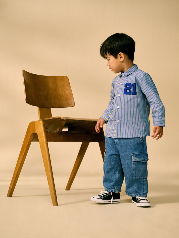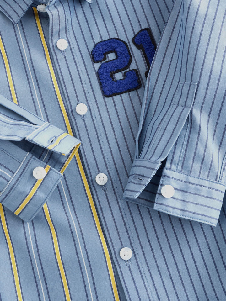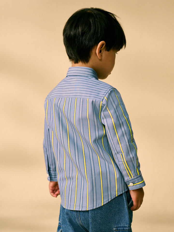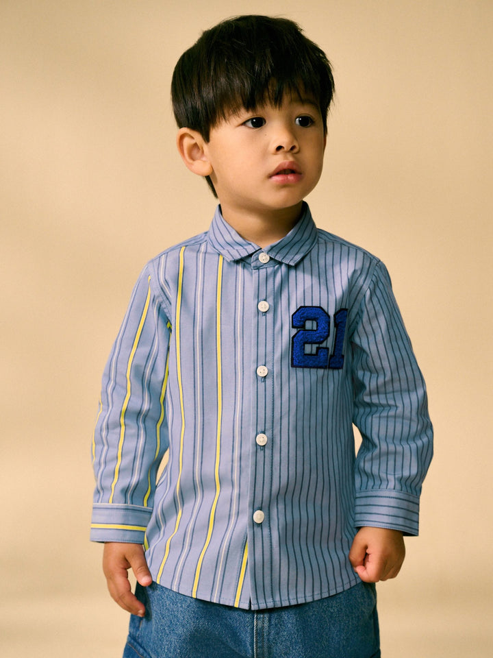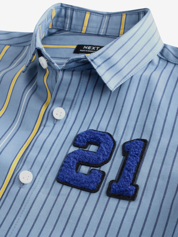 This splice-style shirt is made from pure cotton, with a blue pinstripe and a blue and yellow striped half, a button-up fastening and a classic collar, decorated with a boucle badge to the chest and long sleeves. Regular fit 100% cotton Spliced design Boucle chest motif 100% Cotton. Country of Origin: Bangladesh