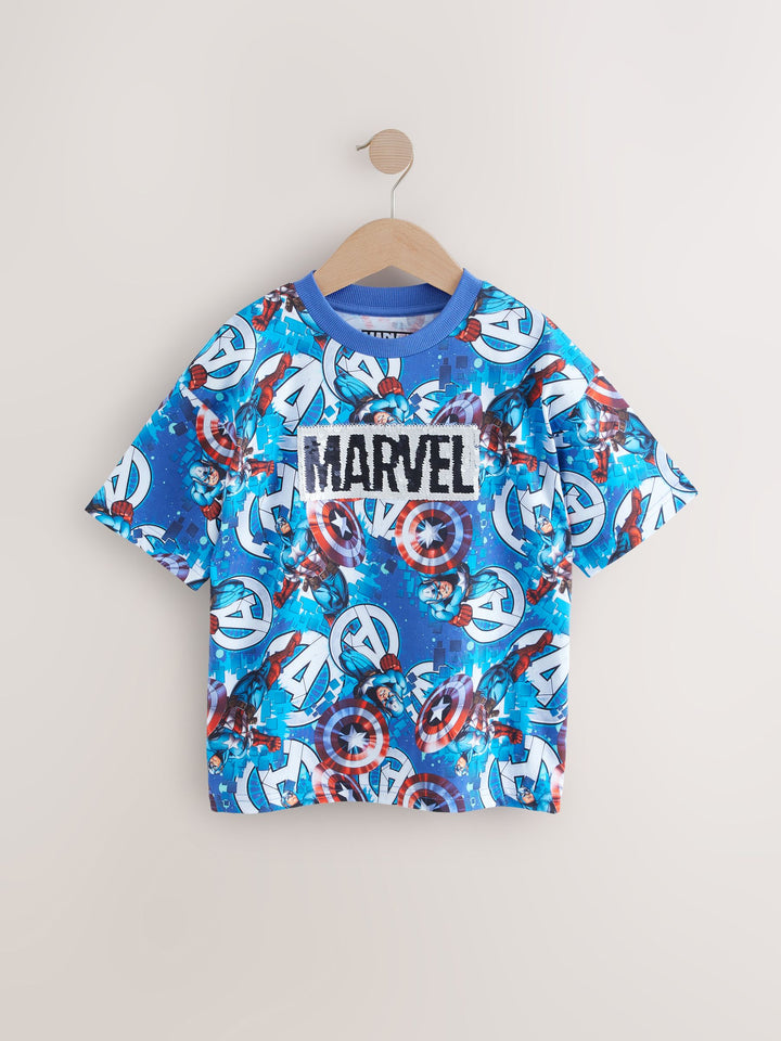With a bright and fun all-over print, this cotton t-shirt showcases official Captain America graphics with flip sequin detailing, ideal for Marvel fans. 100% cotton Licensed Captain America graphic Crewneck collar Flippy sequin detailing Machine washable. 100% Cotton. Country of Origin: India