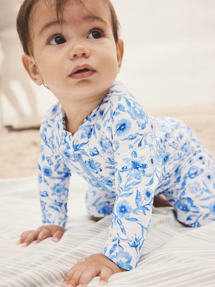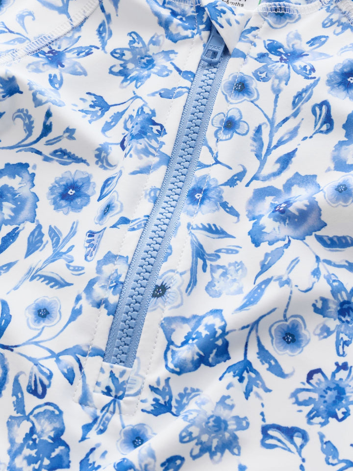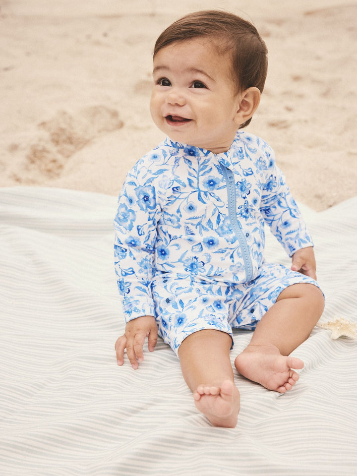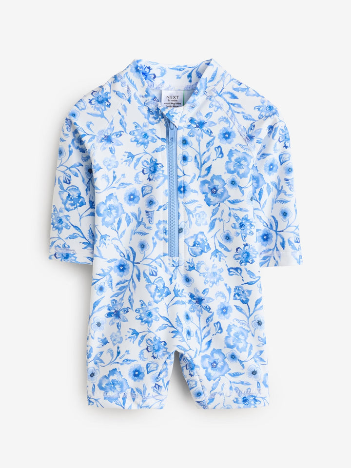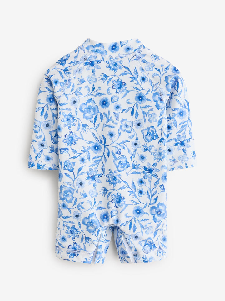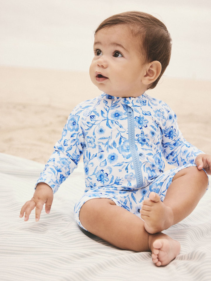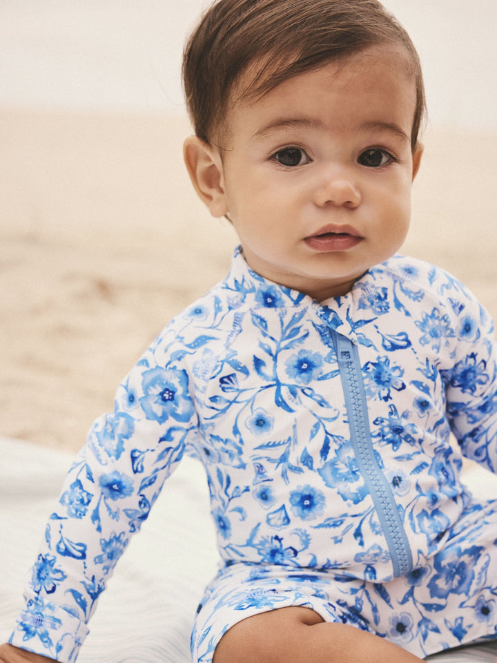 This adorable blue floral print swimsuit gives your baby that bit of extra coverage on beach and pool days, made from a stretchy fabric with a UPF rating of 50+ to protect them from the sun on covered areas. A zip fastening features at the front with a popper for easy dressing, finished with a tall collar and raglan sleeves. Stretchy fabric Tall collar Zip and popper fastening UPF rating of 50+ 82% Recycled polyester, 18% Elastane. Country of Origin: China This fabric will provide protection against solar ultraviolet radiation. It has been independently tested and given a UPF rating of 50+ which blocks more than 97.5% of UV rays. Important Advice: • Sun exposure causes skin damage • Only covered areas are protected • Always use a high protection factor sunscreen on any exposed areas of skin • The protection offered by this fabric may be reduced with use or if stretched or wet • Always rinse in fresh water after each use • Young children should be kept in the shade between 11 and 3 • Don't forget your hat and sunglasses. • Fabric provides UVA +UVB protection from the sun.