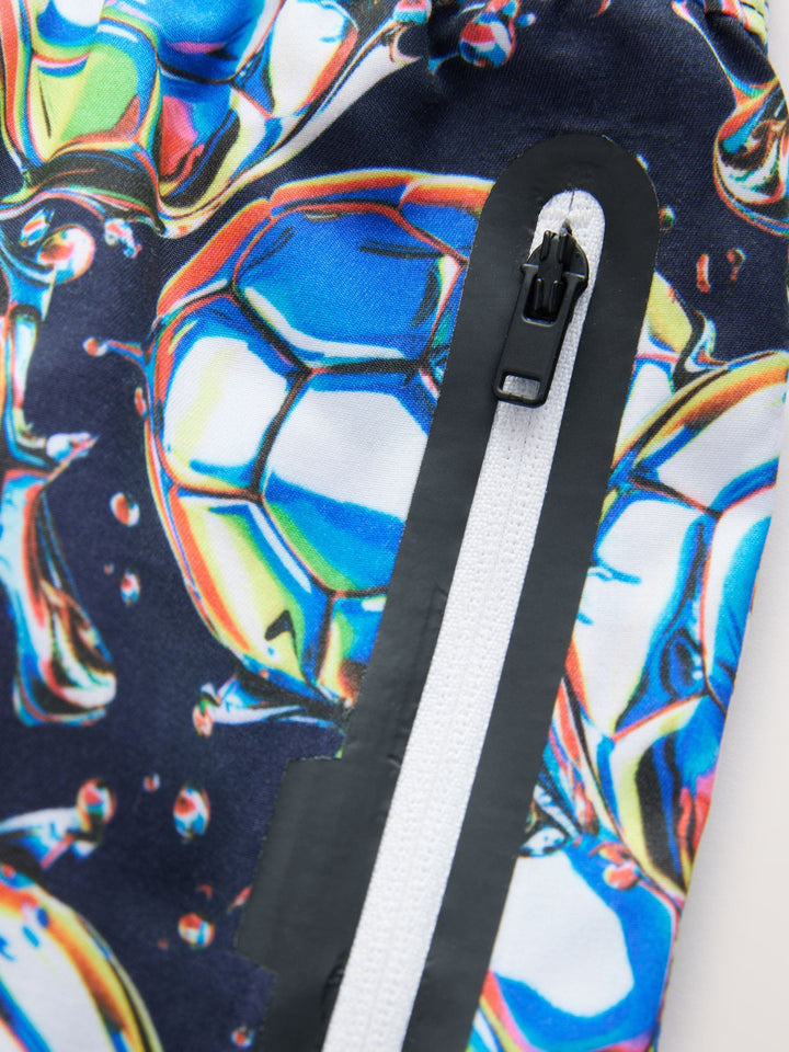 These classic cobalt blue swim shorts have a football glitch design, with an adjustable elasticated waistband, zippered side pockets and a comfortable mesh lining. Regular fit Elasticated waistband Football design Adjustable drawstring Zippered side pockets Machine washable. Main 100% Recycled polyester. Lining 100% Recycled polyester. Country of Origin: Bangladesh