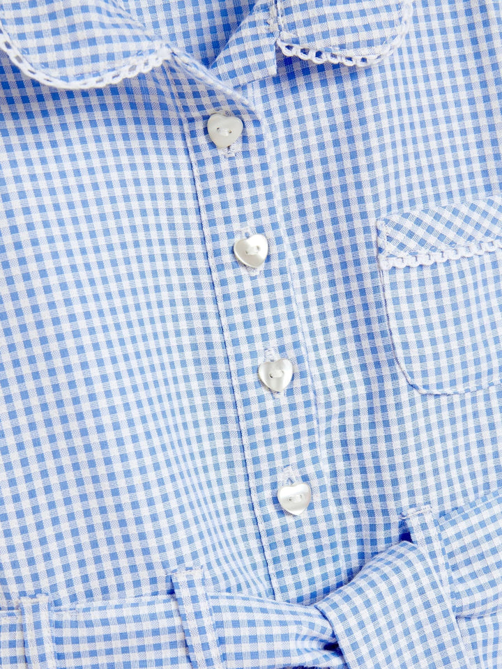 Crank her new term style up a notch with our cute belted gingham school dress. Designed in an easy iron fabric (we see you parents) with a stylish lace trim pocket and collar. The bow belt and side pockets are a nice touch and the heart buttons are absolutely adorable. Complete the look with the matching scrunchie. She'll love this one just as much as you. Key features Easy Iron Fabric - Handy easy-iron finish Cotton Rich - Cotton rich blend for ultimate comfort and breathability. Machine washable Gingham dress Lace trim Bow design belted style Side pockets Heart buttons 60% Cotton, 40% Polyester. Country of Origin: Sri Lanka