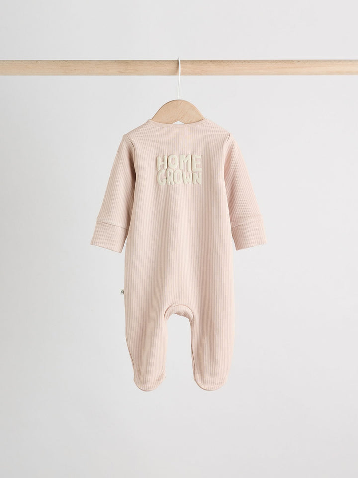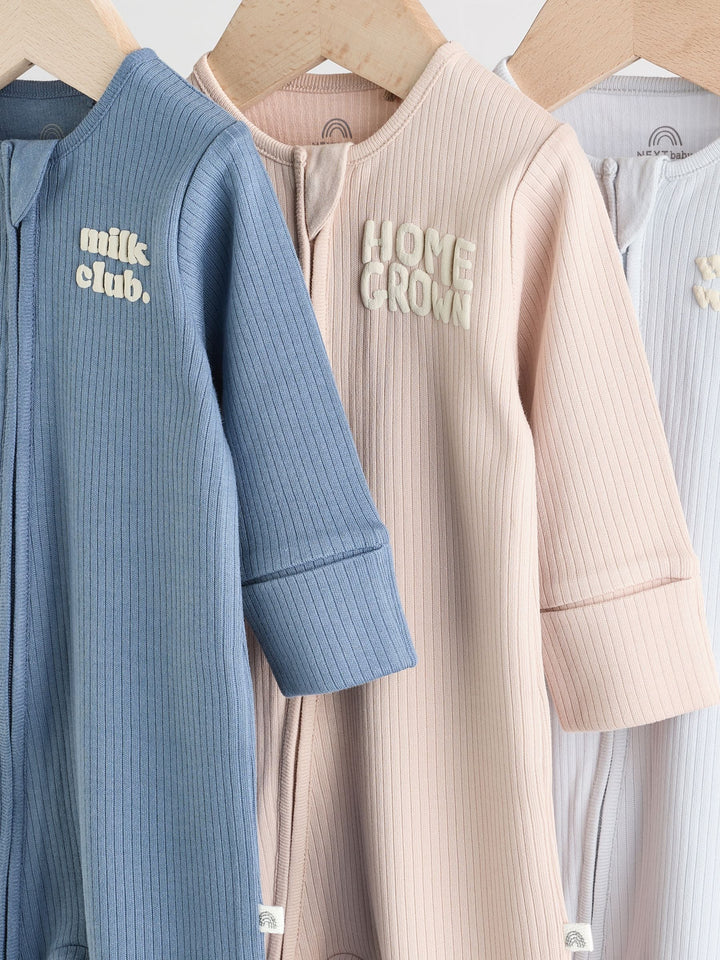 Our 3 pack of baby sleepsuits are ideal for stocking up on essenitals. Made from pure cotton, each piece is long sleeve and rib texure. The two way zip fastening makes for easy dressing with a fun slogan design on the front and back. 3 pack 100% cotton Long sleeve Slogan design Two way zip fastening Machine washable. 3 x Sleepsuit 100% Cotton. Country of Origin: India Warning: Keep away from fire and flames.