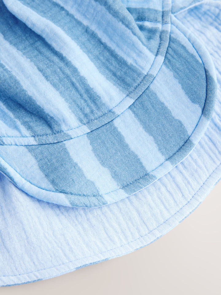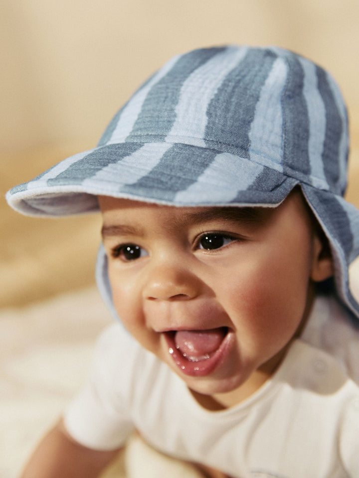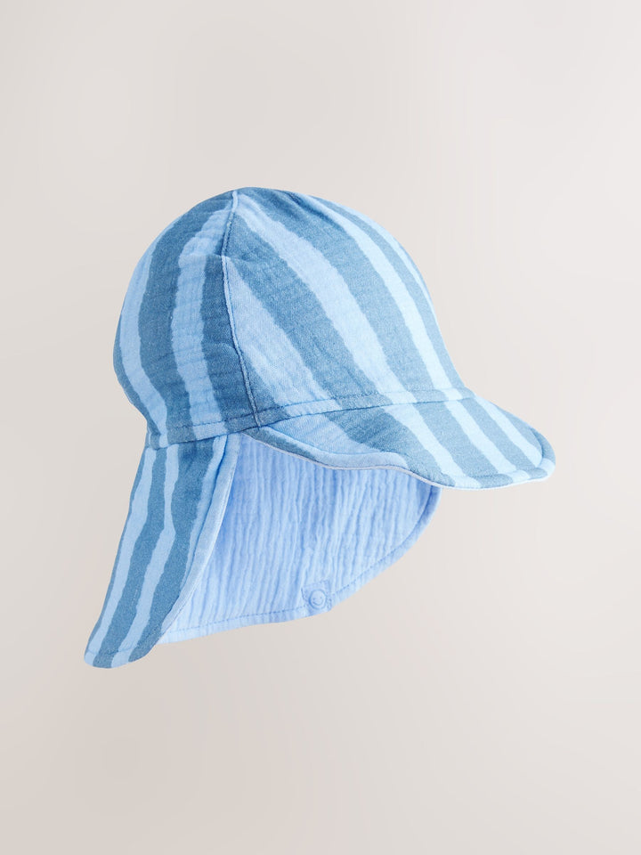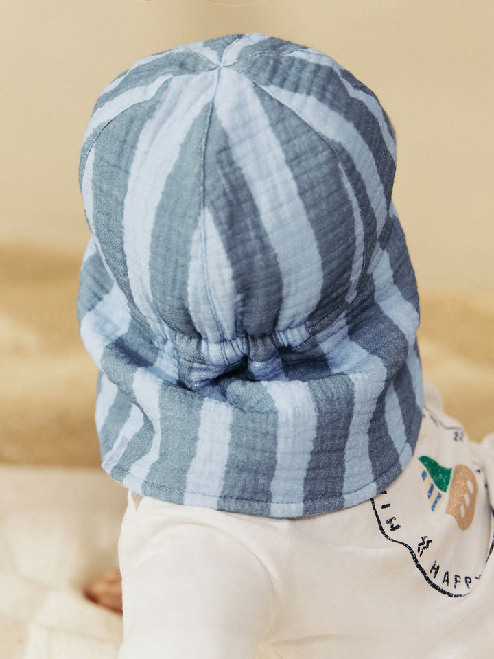 This reversible blue and blue stripe legionnaire hat has a pure-cotton fabric with a curved peak and a flap to the back for neck and ear coverage on sunny days, trips to the beach or holidays. Legionnaire hat Curved peak Ear and neck flap 100% cotton Machine washable. Main 100% Cotton. Reverse 100% Cotton. Country of Origin: China Warning: Keep away from fire and flames.