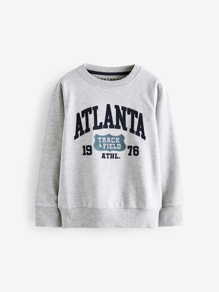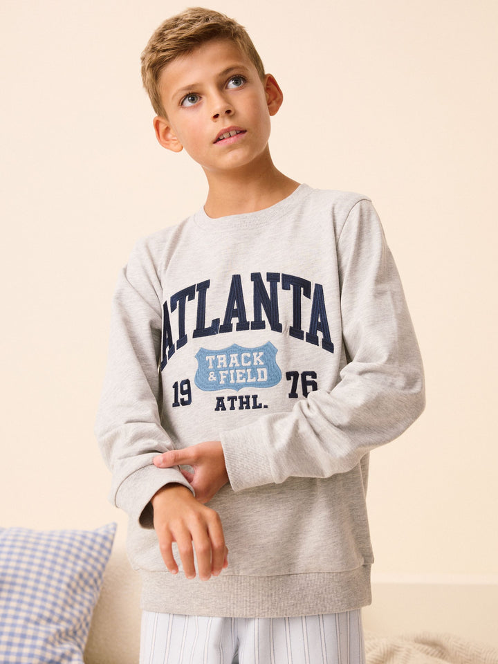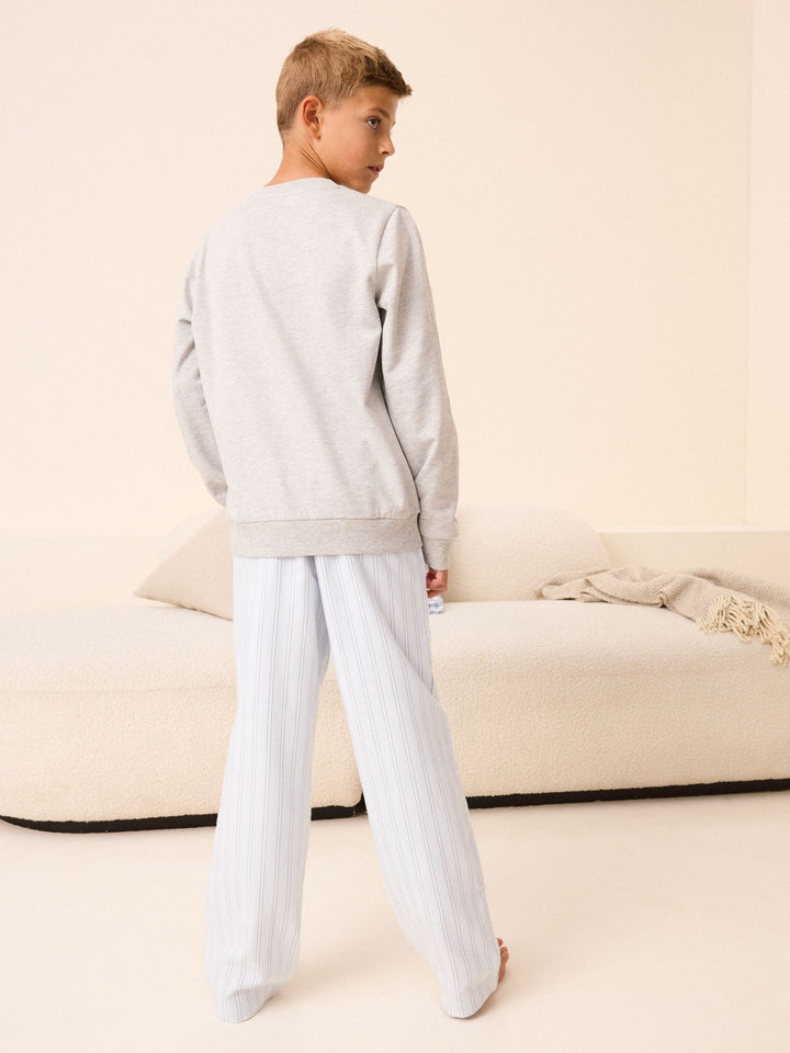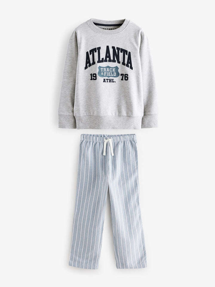 These classic single woven pyjamas are ultra cosy in a 2-piece set, featuring a crewneck sweatshirt-style top with varsity-inspired stitched graphics, alongside a pair of striped pure-cotton full-length bottoms. 2-piece set Crewneck long sleeve top Stitched graphics 100% cotton bottoms Striped design Machine washable. Pyjama Top 95% Cotton, 5% Viscose. Pyjama Bottom 100% Cotton. Country of Origin: Bangladesh Warning: Keep away from fire and flames.