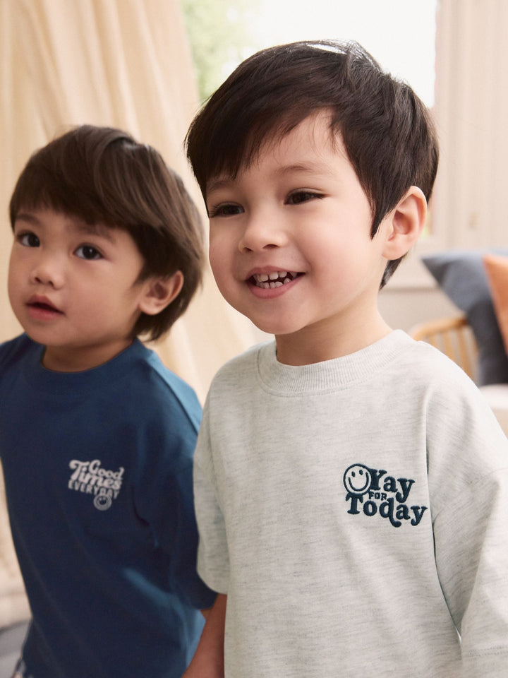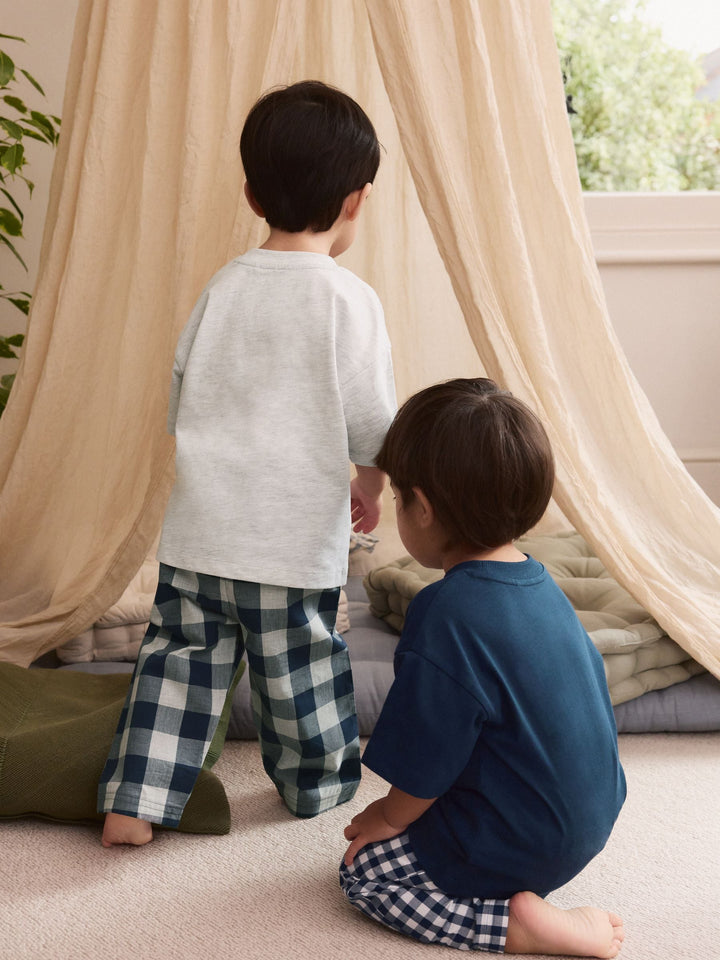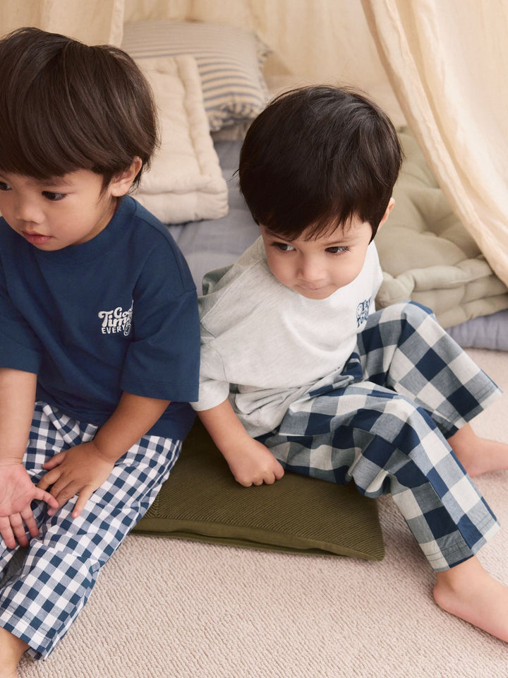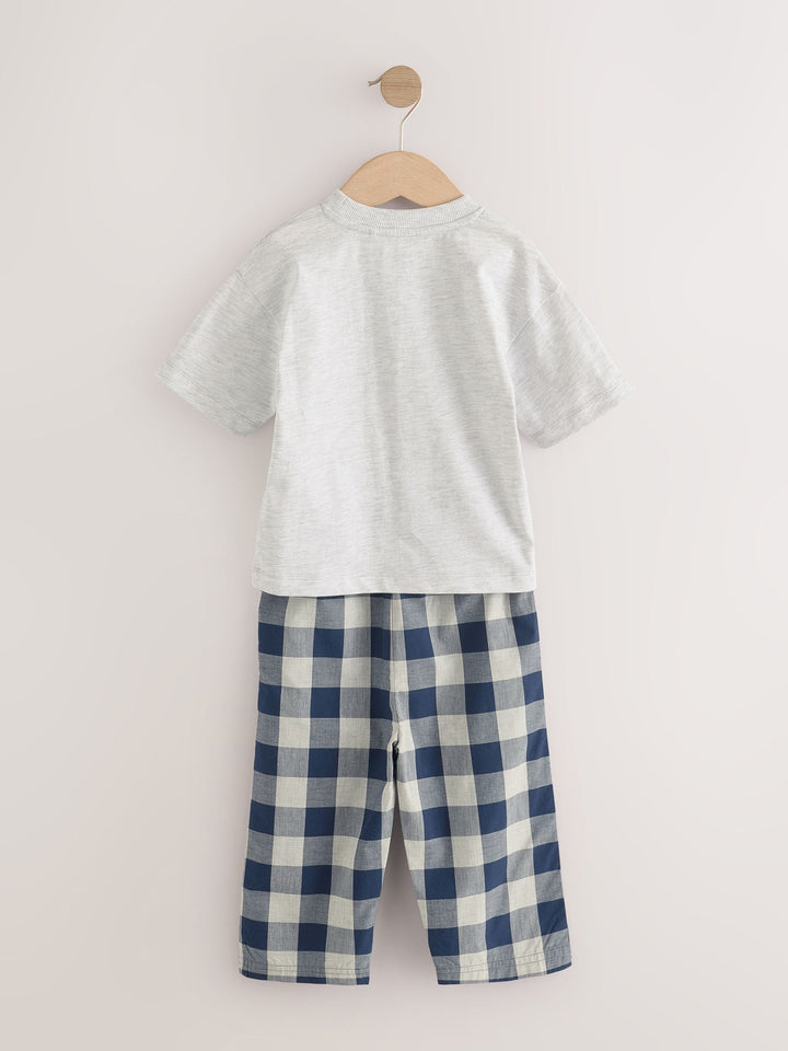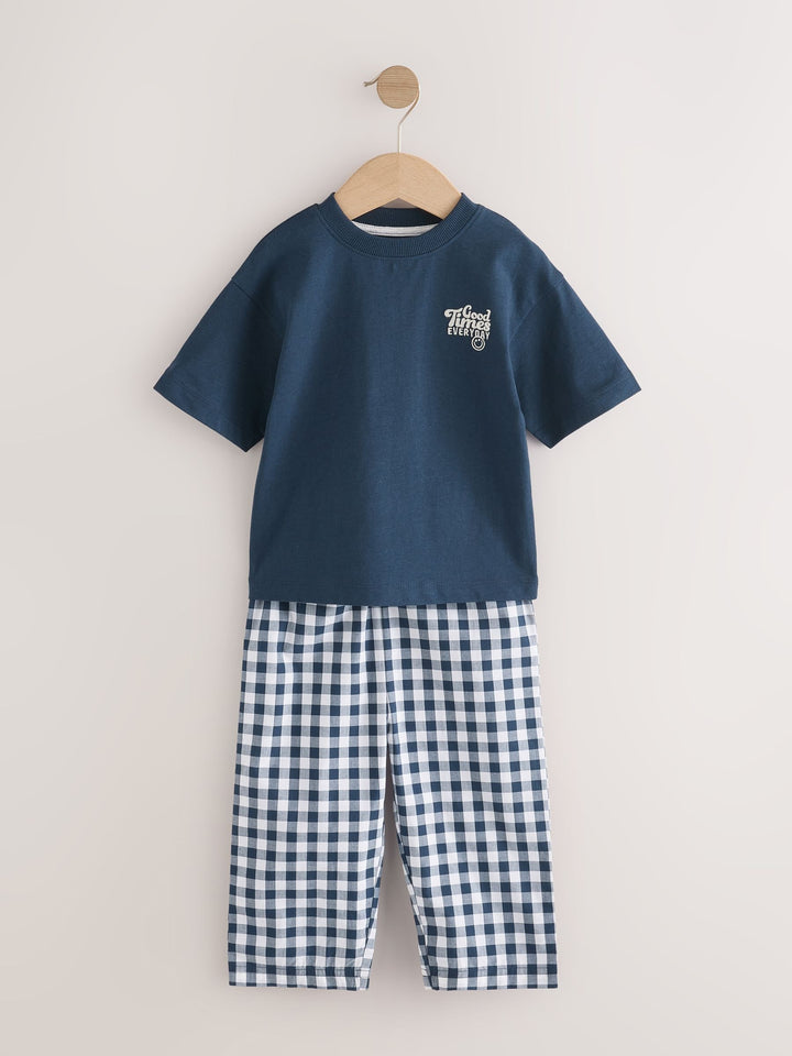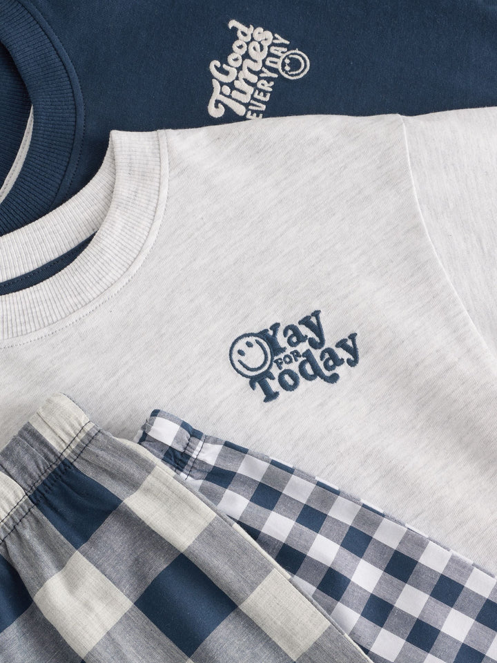 This 2-pack of pyjamas are made from a soft cotton-rich fabric that's sure to keep them comfortable all night, with short sleeve t-shirts featuring positive messaging to the chest, alongside full-length check print bottoms with adjustable elasticated waistbands. 2-pack Cotton-rich fabric Short sleeve t-shirts Positive graphic prints Check bottoms Elasticated waistband Machine washable. 2 x Pyjama Top 99% Cotton, 1% Viscose. 2 x Pyjama Bottom 100% Cotton. Country of Origin: Bangladesh Warning: Keep away from fire and flames.