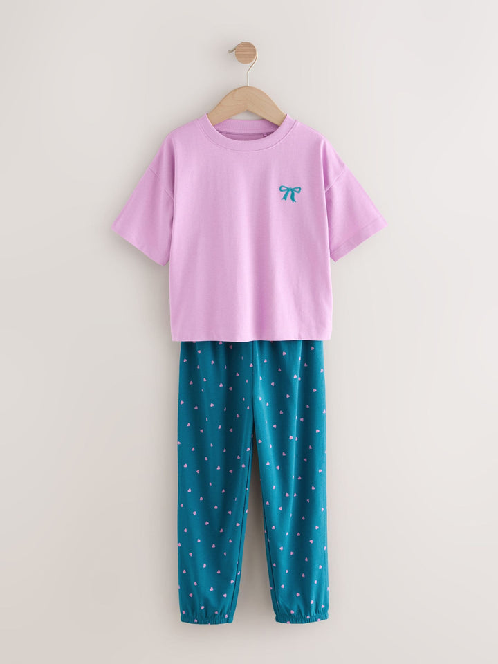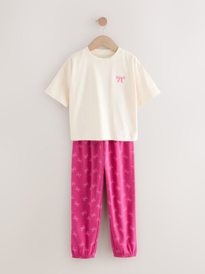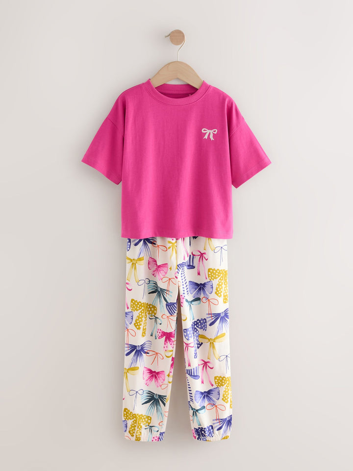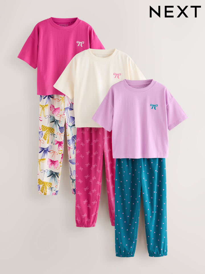 Make her bedtime fun and bright with this 3 pack of bow joggers pyjamas. The soft fabric and comfortable fit ensure a snug feel for all-night wear. The pack includes three different sets in vibrant colours and prints, each finished with a charming embroidered bow detail on the top. Embroidered bow detail Short-sleeved tops Elasticated waistband Matching joggers Vibrant colours and prints 3 pack Machine washable. 3 x Pyjama Top and 3 x Pyjama Bottom 100% Cotton. Country of Origin: Bangladesh Warning: Keep away from fire and flames.