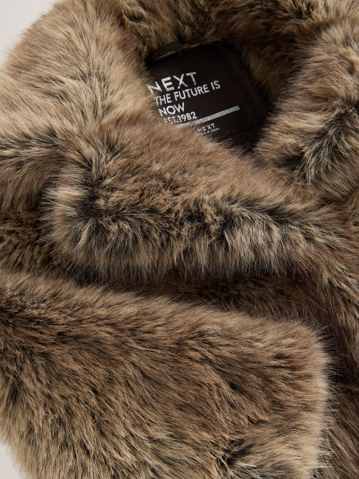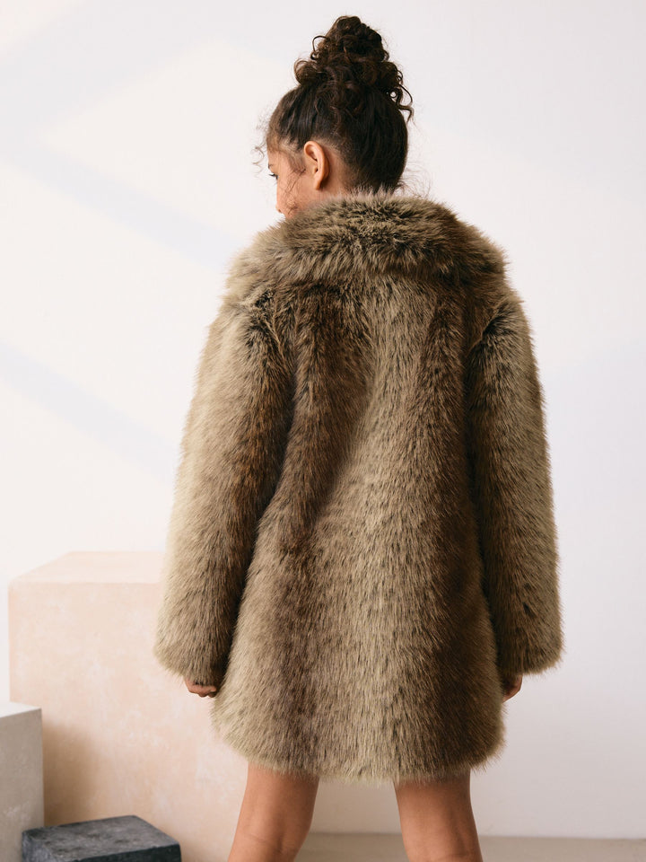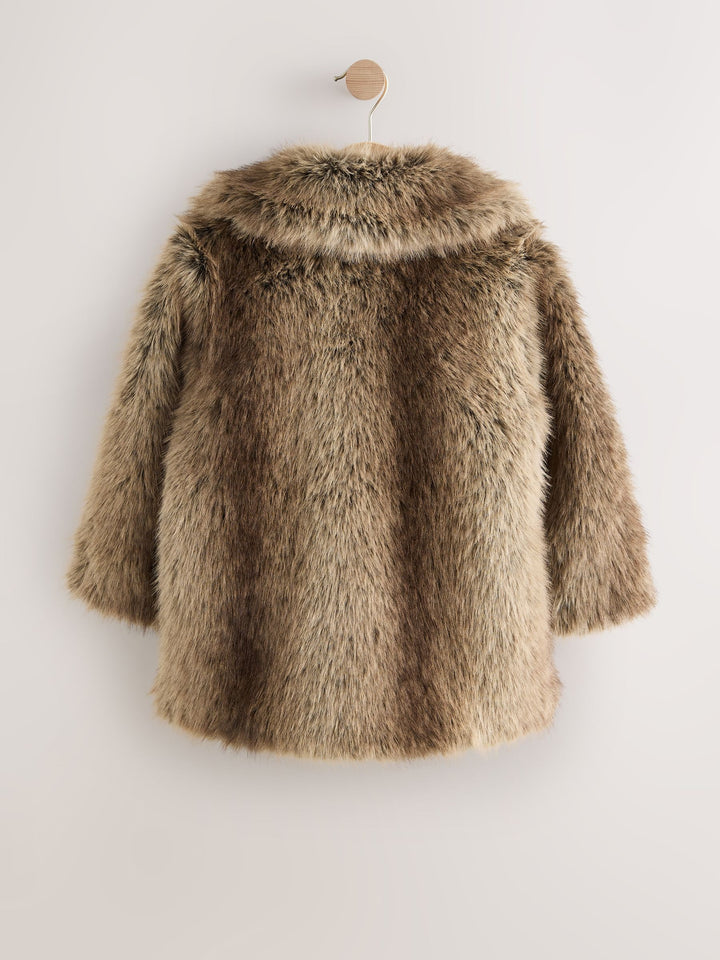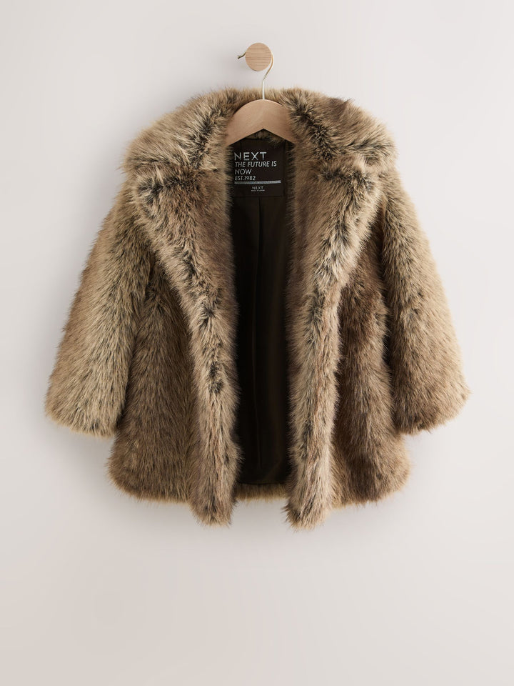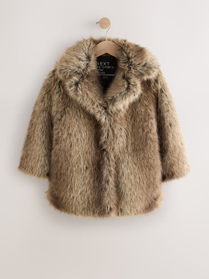 They will stay warm and stylish in this brown faux fur coat. The soft faux fur and cosy full lining provide a luxurious feel and a touch of glamour. With a classic collar and mid-length fit, it's a versatile choice for a special occasion or a casual day out. Faux fur Fully lined Mid length Classic collar Machine washable. Main 100% Polyester. Lining 100% Recycled polyester. Country of Origin: China