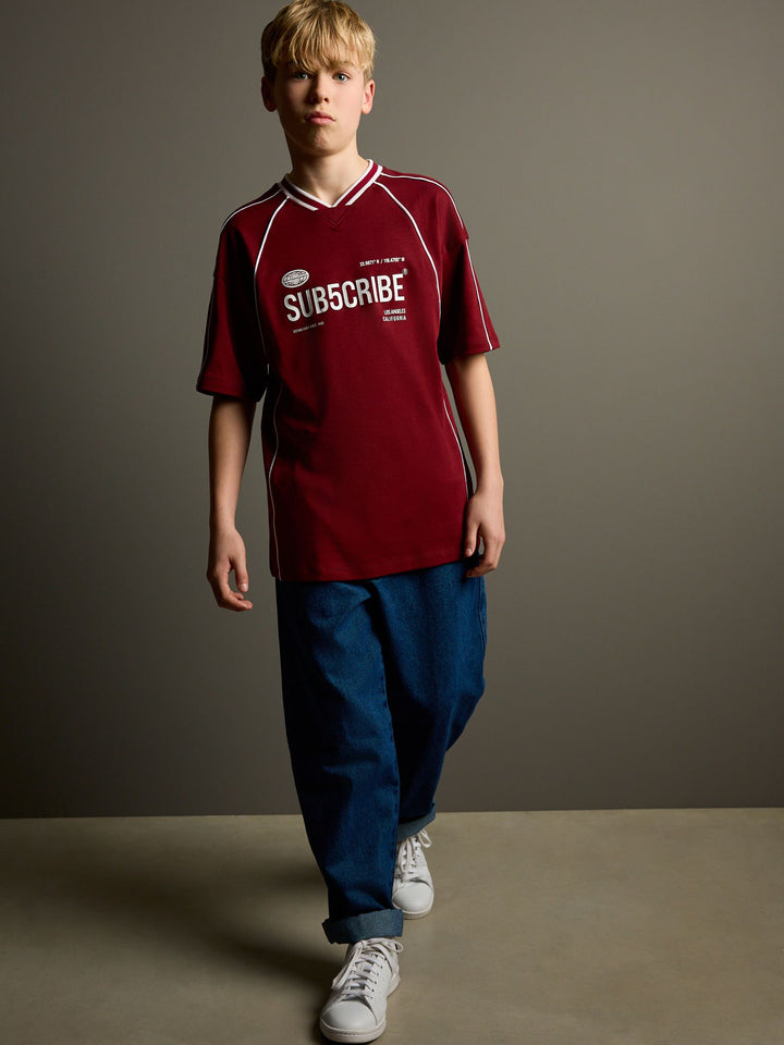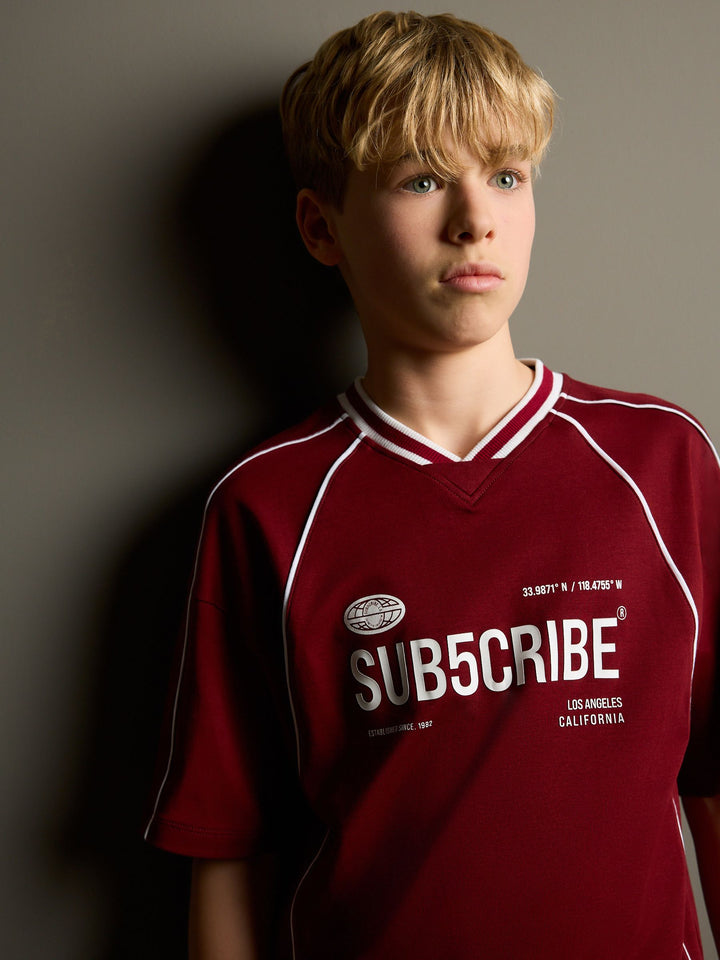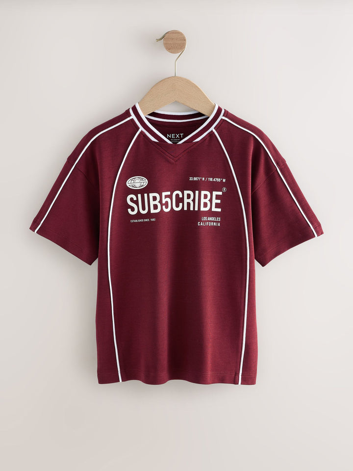 This sporty jersey-inspired t-shirt is perfect for everyday wear, with trendy Sub5cribe graphic prints, a V-neck collar and contrast piping detail. 100% cotton V-neck collar Sporty design Graphic print Contrast piping Machine washable. 100% Cotton. Country of Origin: Bangladesh