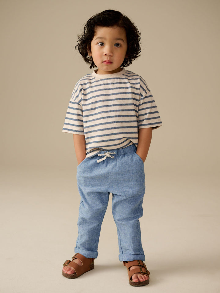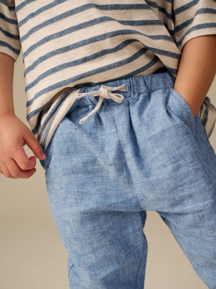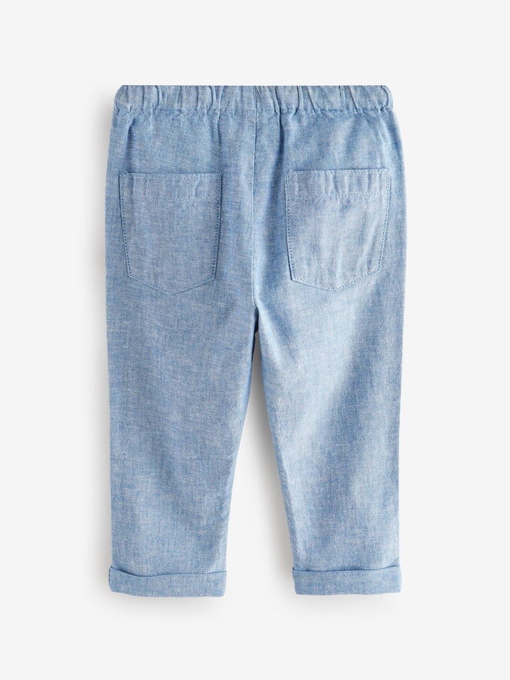 Easy to wear, stylish and made from a summer-friendly cotton and linen blend, these chambray blue trousers have a loose fit, an adjustable elasticated waistband, side pockets and a turn-up ankle hem. Loose fit Cotton and linen blend Elasticated waistband Adjustable drawstring Side pockets 55% Linen, 45% Cotton. Country of Origin: Bangladesh