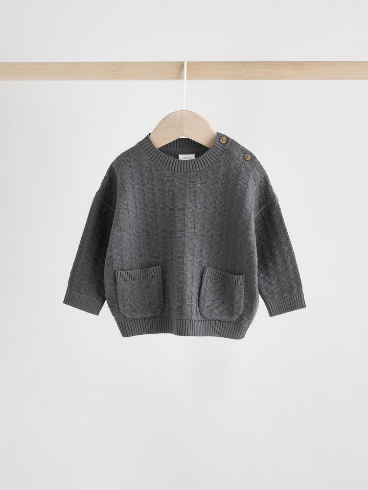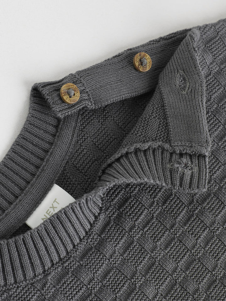 An easy addition to your little one's wardrobe, this 2-piece set in charcoal grey is designed in a lovely textured knit. Featuring a crew neck, ribbed hem top with long sleeves, patch pockets and button fastenings to the shoulder alongside matching pull-on trousers with ribbed cuffs and tie detail to the waist. 2-piece set Long sleeve top Patch pockets Button fastening Matching leggings Machine washable. Jumper and Leggings 100% Cotton. Country of Origin: Bangladesh Warning: Keep away from fire and flames.