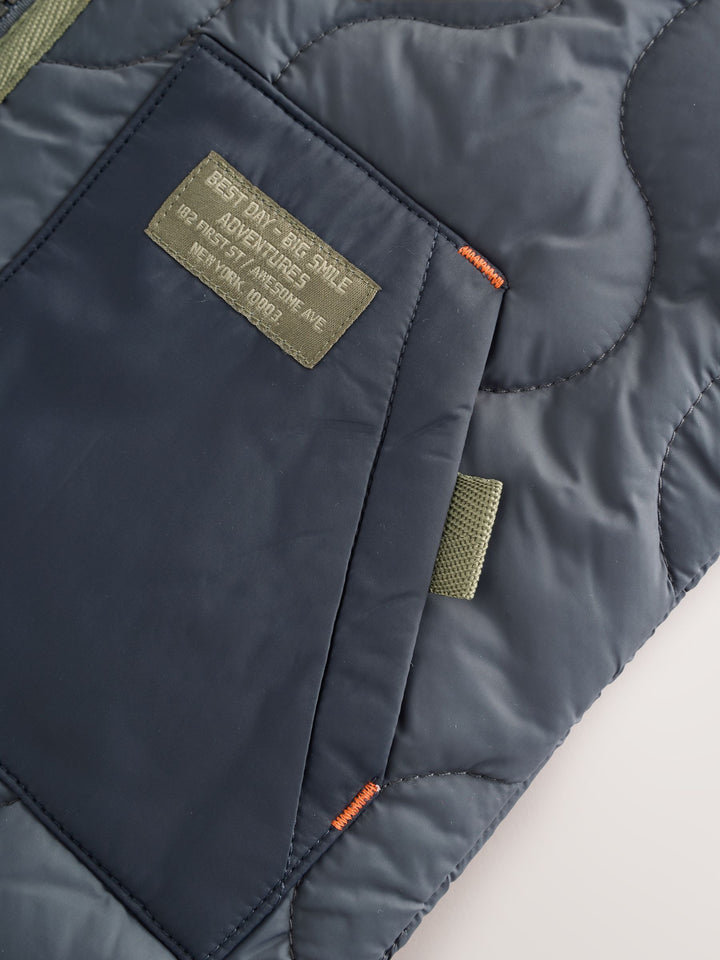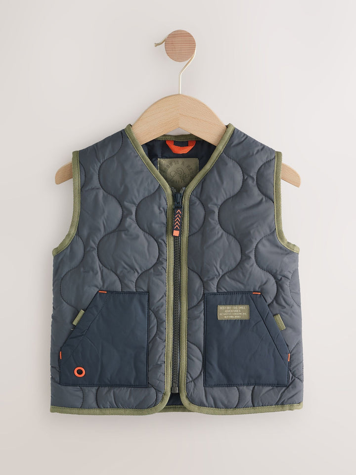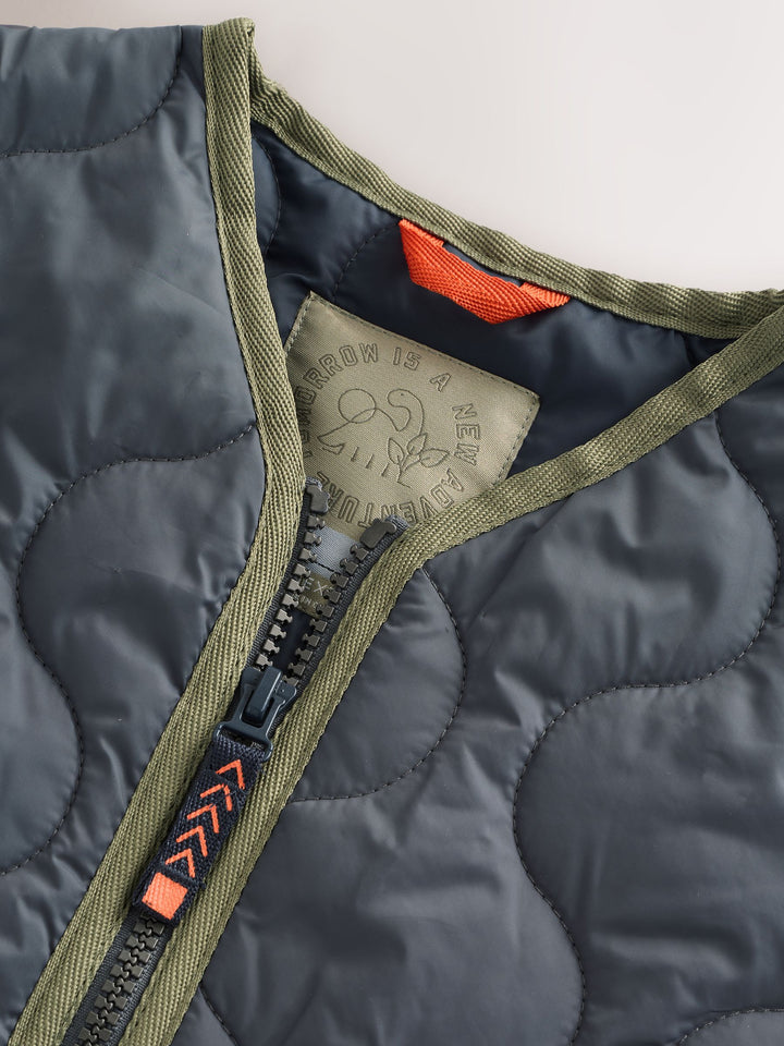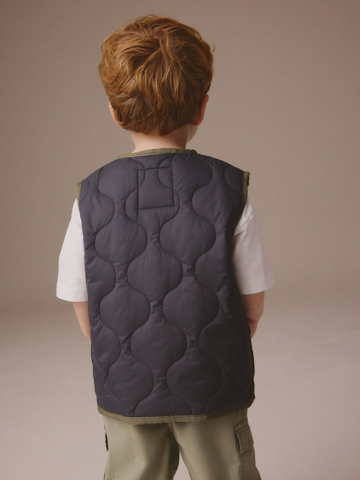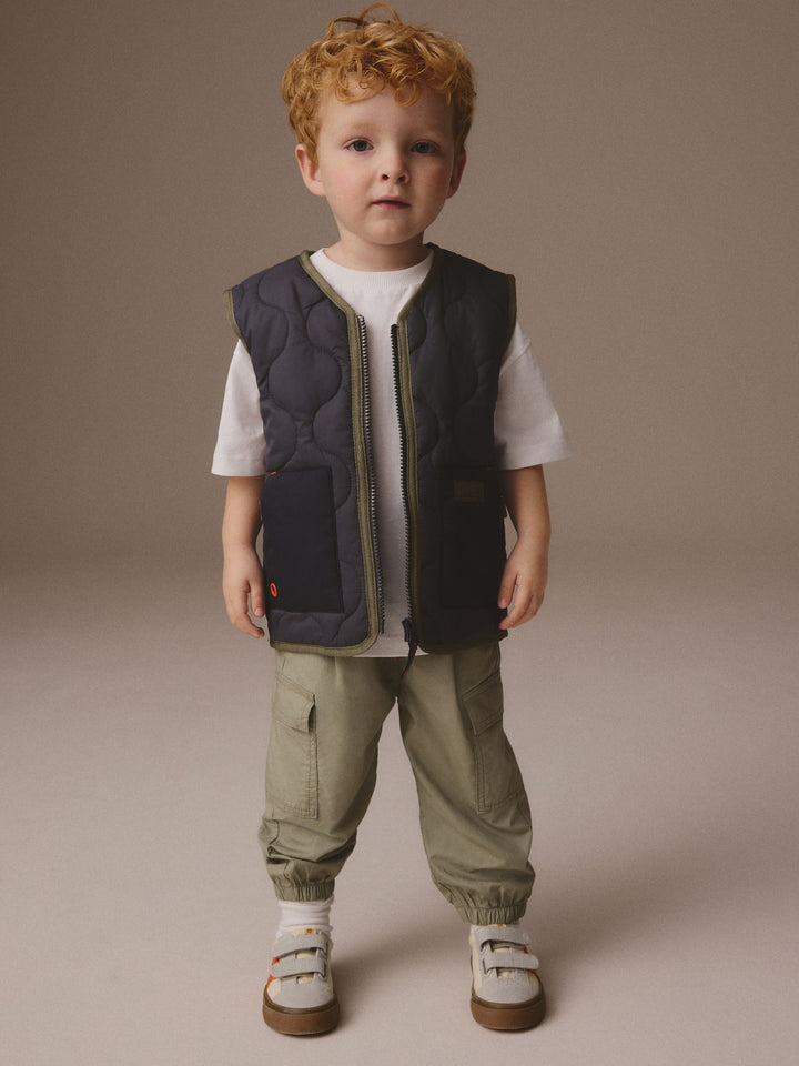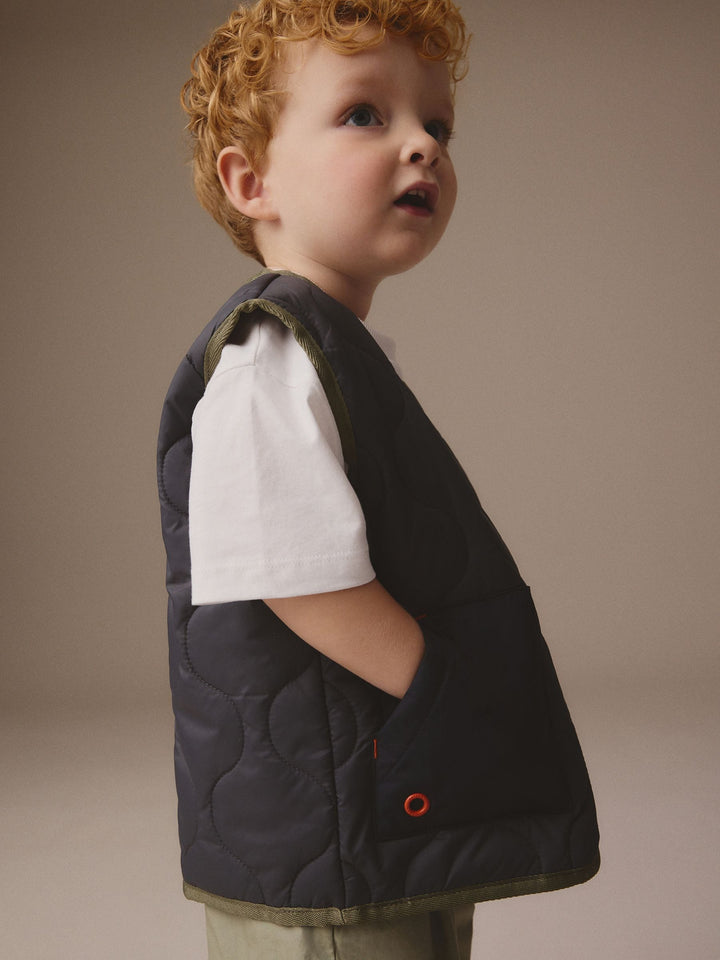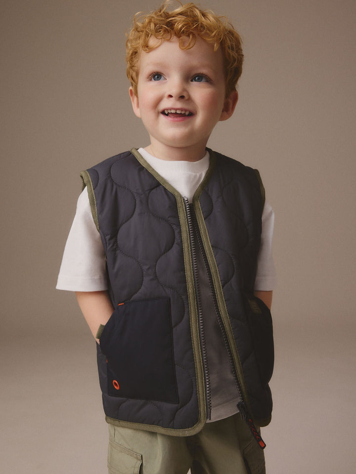 Great for layering, this utility-inspired gilet will elevate any of their casual outfits, featuring a warm quilted design with an onion-shaped stitching, a V-shaped collar and a full zip fastening. The gilet is finished with two patch pockets and khaki piped trims. Sleeveless Zip fastening V-shaped neck Onion-shaped stitching Patch pockets Machine washable. Main 100% Recycled polyester. Lining 100% Recycled polyester. Wadding 100% Recycled polyester. Country of Origin: China