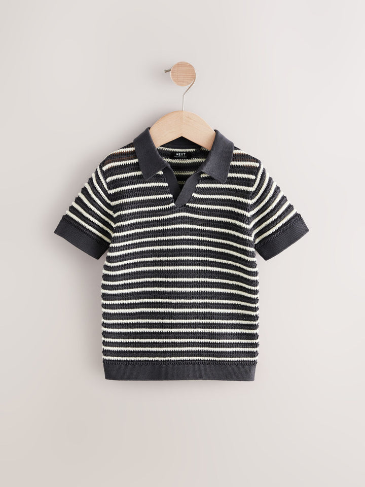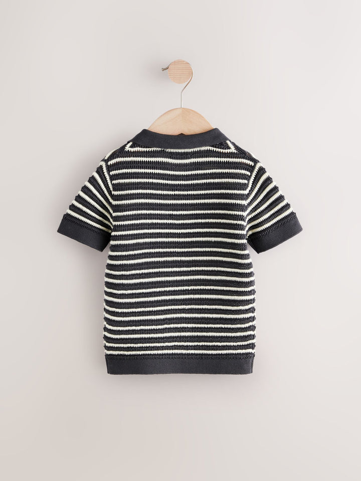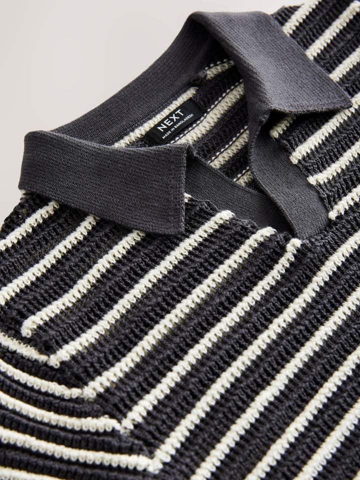 Made from pure comfortable cotton, this short sleeve charcoal grey stripe polo shirt has a textured yarn finish for a breathable feel, finished with an open collar and ribbed hems. 100% cotton Knitted fabric Open collar Ribbed hems 100% Cotton. Country of Origin: Bangladesh