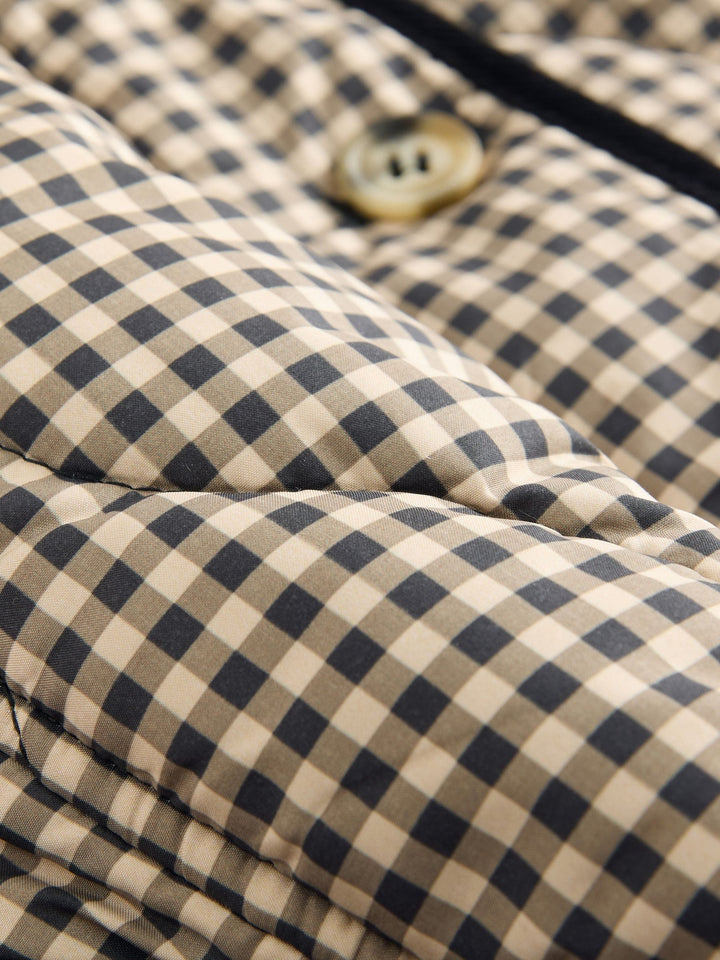 A stylish and practical choice for her next adventure, this shower resistant quilted coat is designed for both comfort and fun. The fully lined inner provides ultimate warmth, while the check pattern and cord trims add a charming touch to her look. Shower resistant Cord trims Quilted Fully lined Machine washable. Main 100% Recycled polyester. Lining 100% Polyester. Wadding 100% Recycled polyester. Country of Origin: China