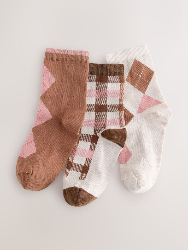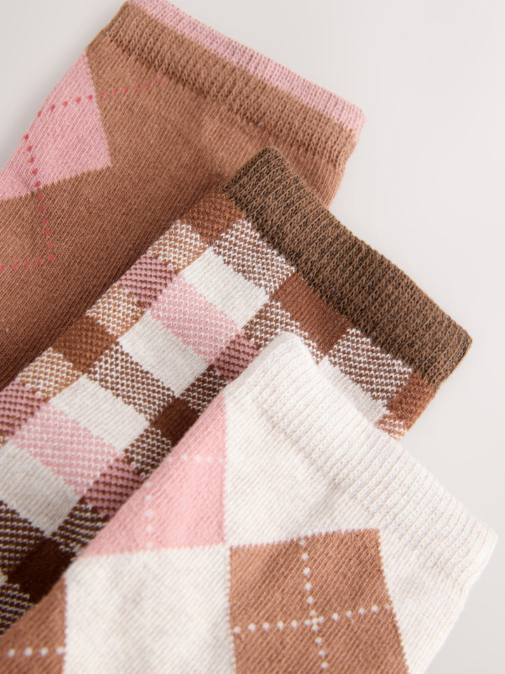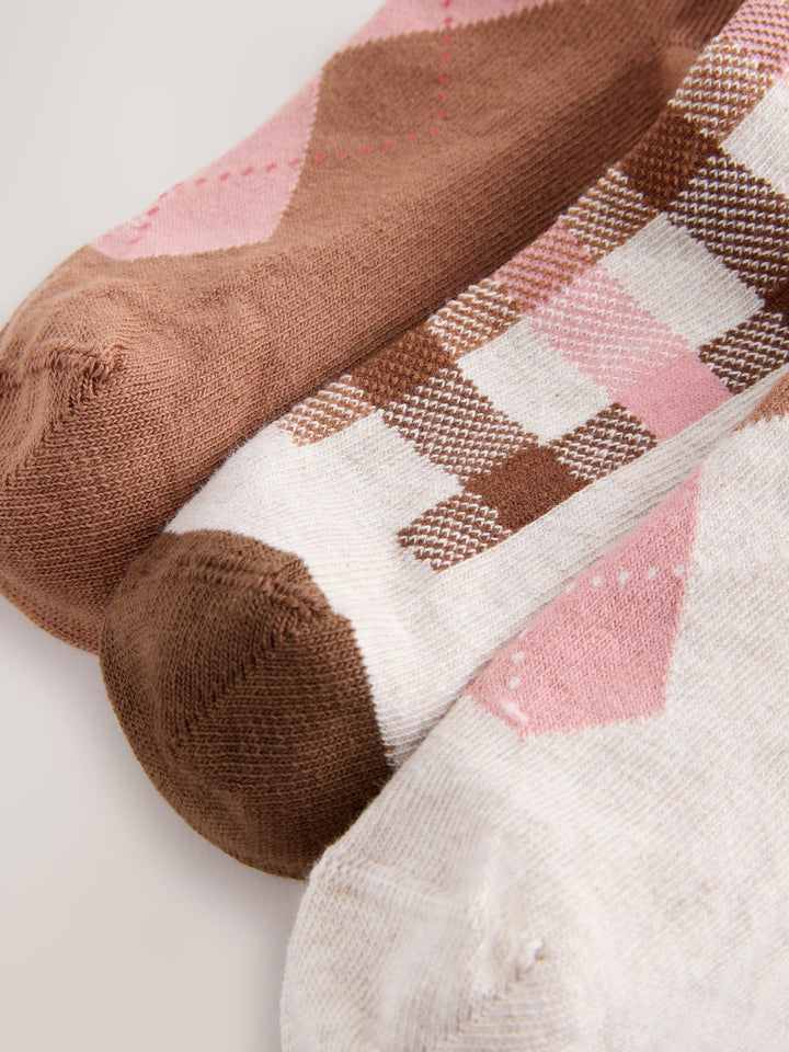 Chocolate Brown and Oatmeal Cotton Rich Argyle Ankle Socks 3 Pack