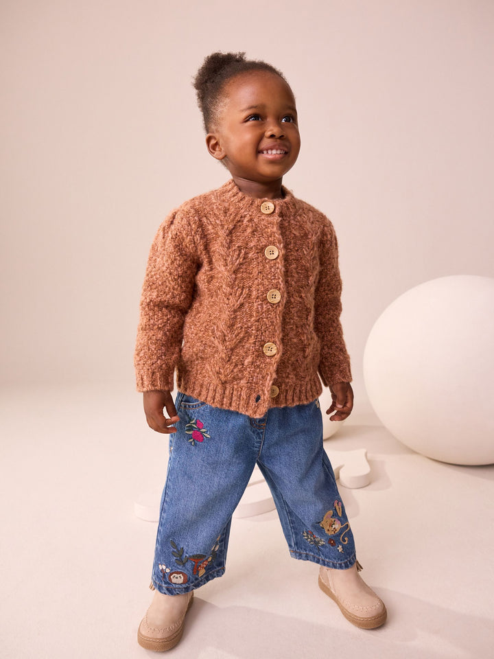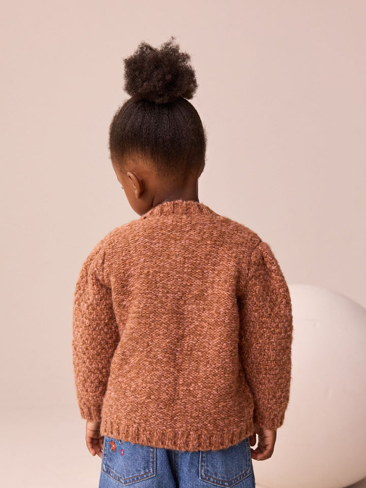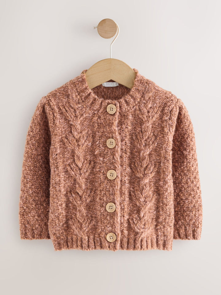 Keep your little one warm in this Chunky Knit Bobble Cardigan. This adorable knit is a cosy and cute layer, perfect for adding warmth to any outfit. It features a classic round neck and is knitted with a chunky, textured design that includes intricate bobble and cable knit details. The long sleeves and regular fit ensure comfort, while the contrasting brown button front fastening makes for easy dressing. Button front fastening Round neck Long sleeve Regular fit 100% Recycled polyester. Country of Origin: Myanmar