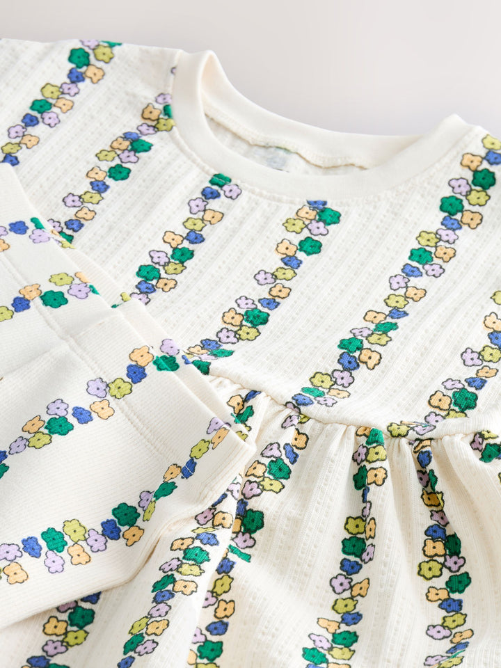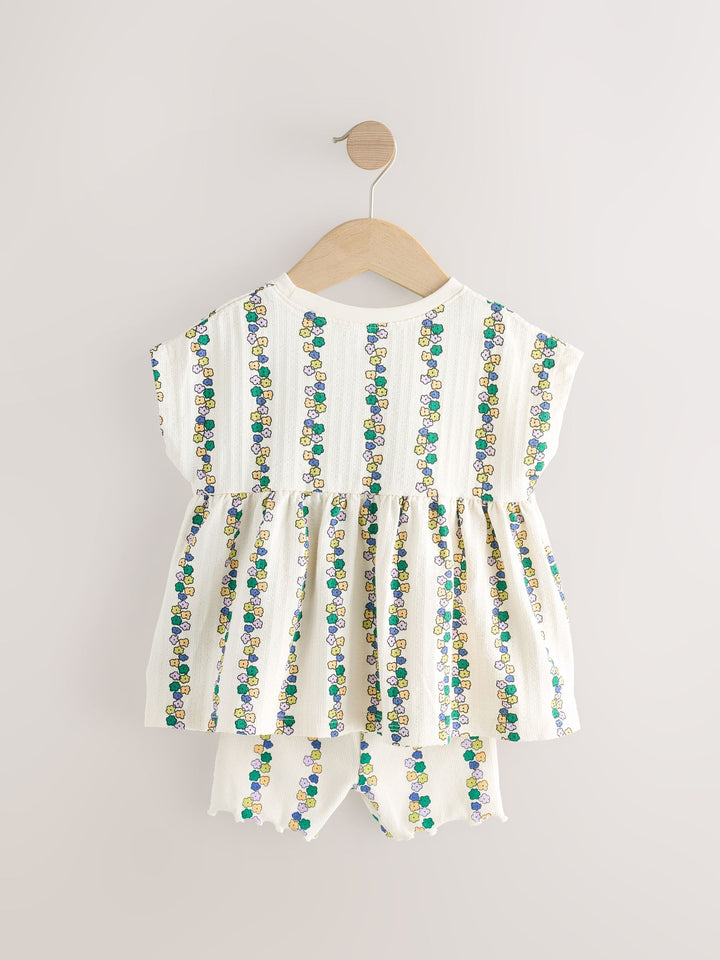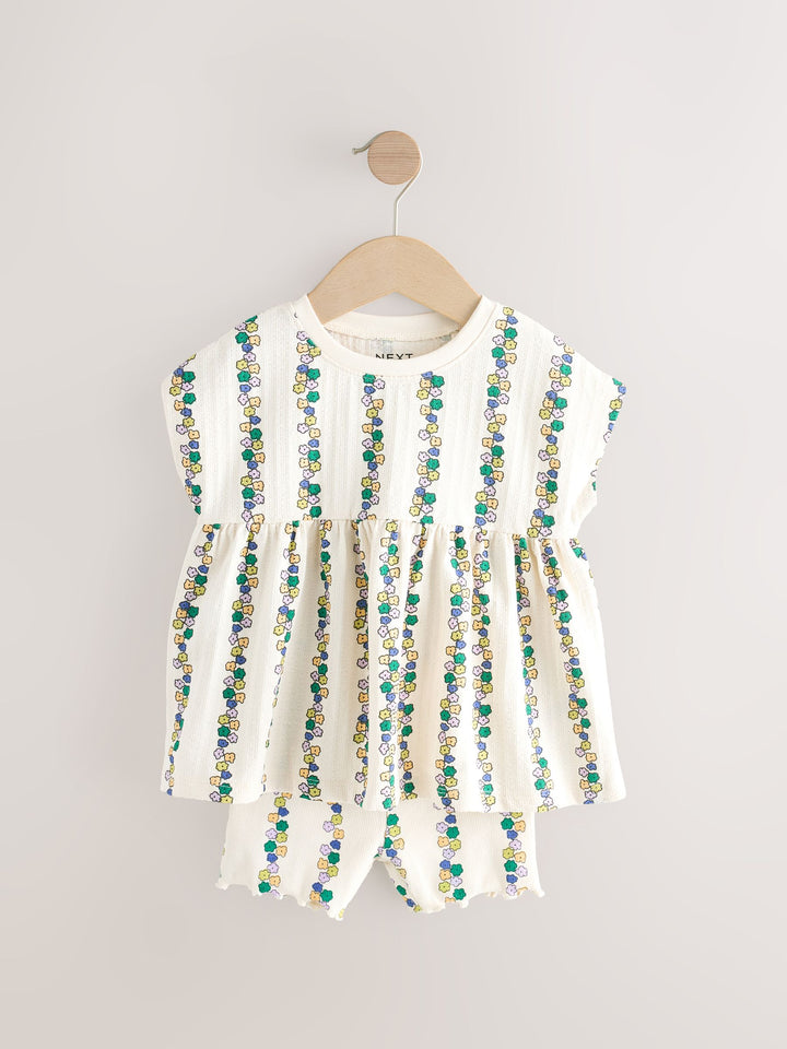 This cream floral 2-piece set is a pretty option for everyday wear, featuring a short sleeve peplum top with a round collar in a textured cotton fabric, alongside a pair of matching cycle shorts. 2-piece set 100% cotton peplum top Round collar Textured fabric Cycling shorts Machine washable. T-shirt 100% Cotton. Shorts 95% Cotton, 5% Elastane. Country of Origin: India