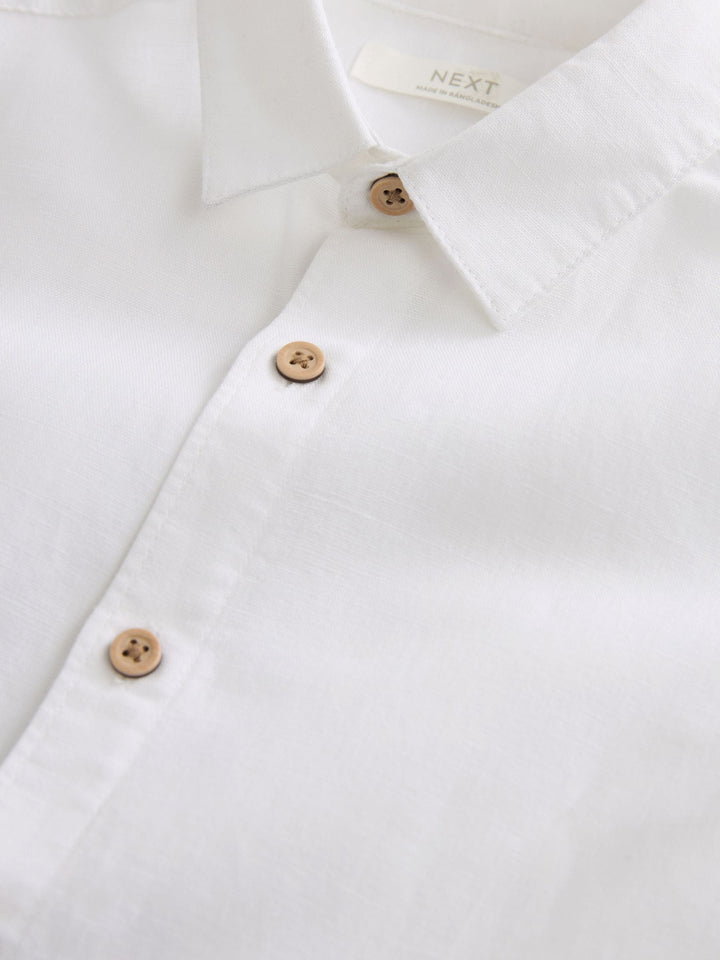 This stylish and breathable white cotton and linen blend shirt features a button-up fastening, a pointed collar and short sleeves, perfect for wearing over a t-shirt for a layered casual look. Regular fit Cotton and linen blend Button-up fastening Pointed collar Short sleeves 55% Linen, 45% Cotton. Country of Origin: Myanmar