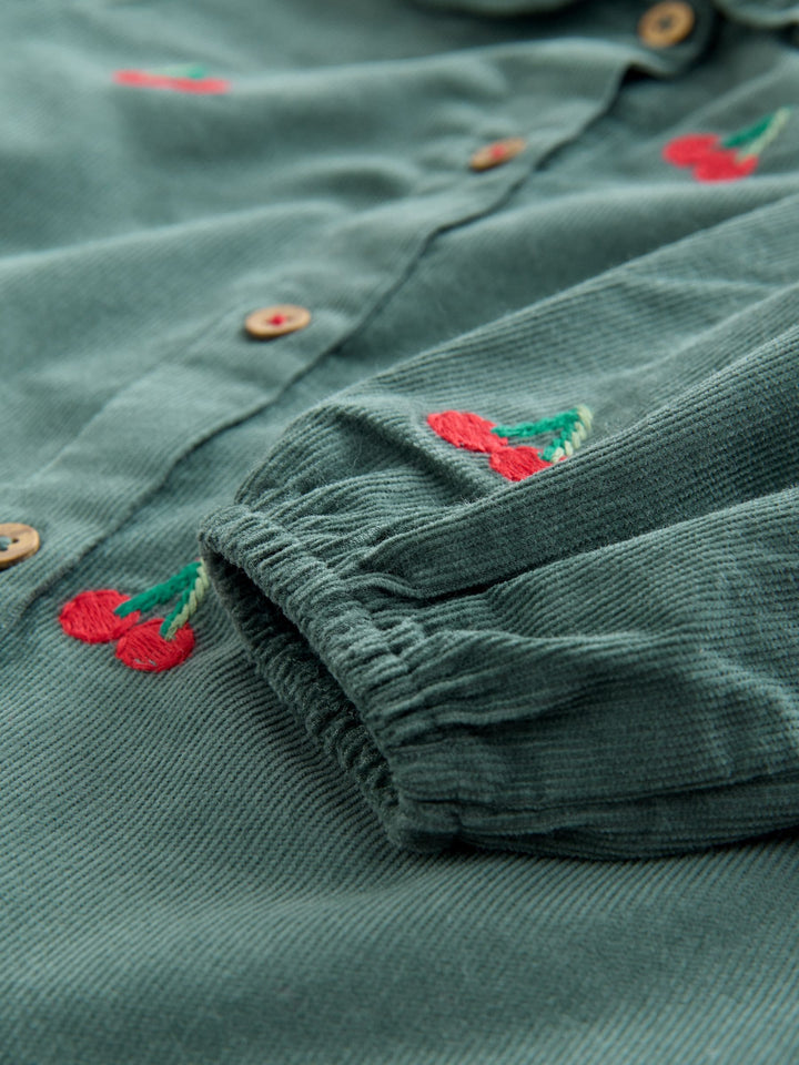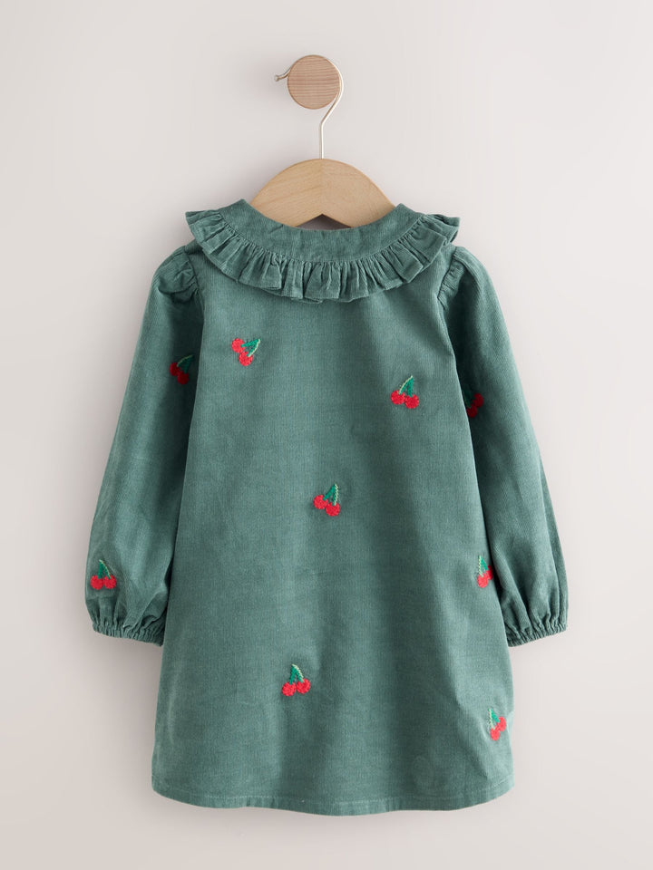 Dark Green Cherry Embroidered Cord Long Sleeve Dress (3mths-8yrs)