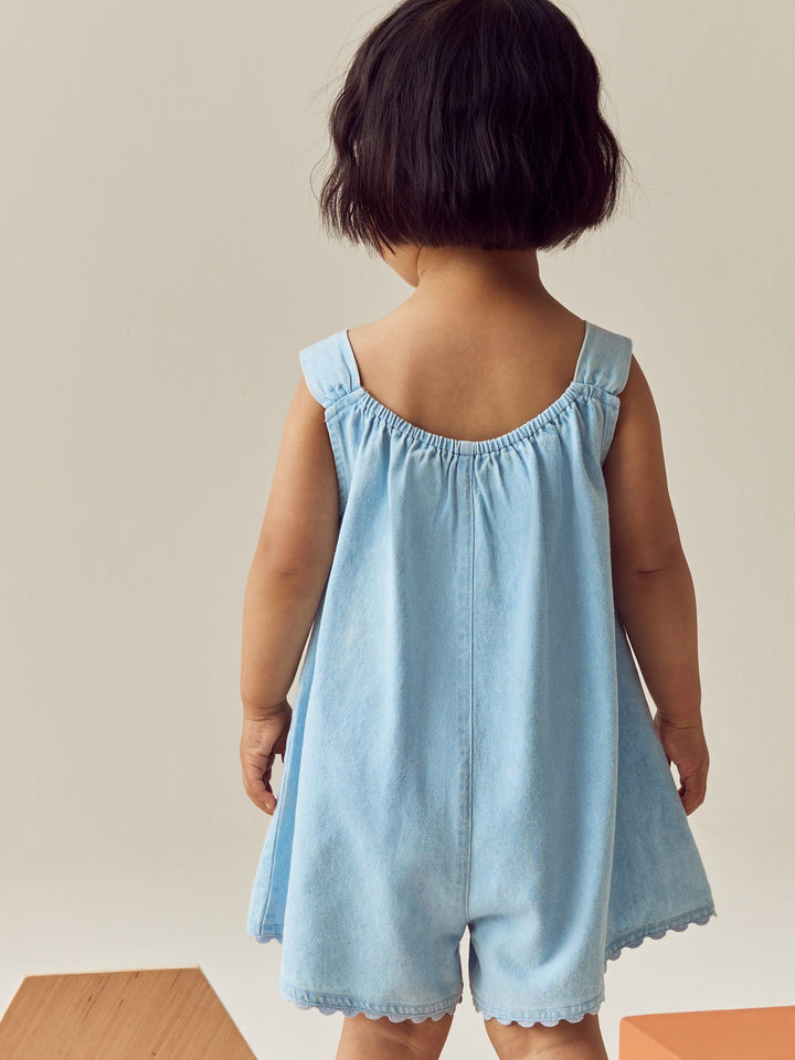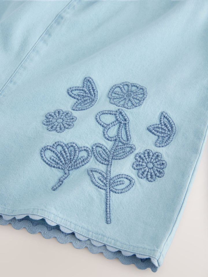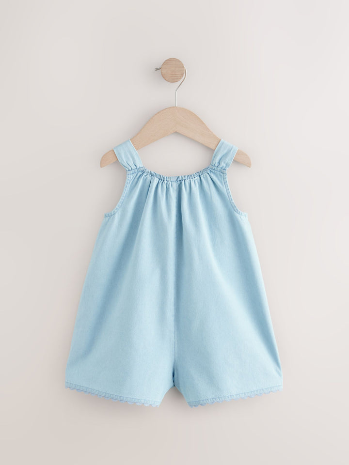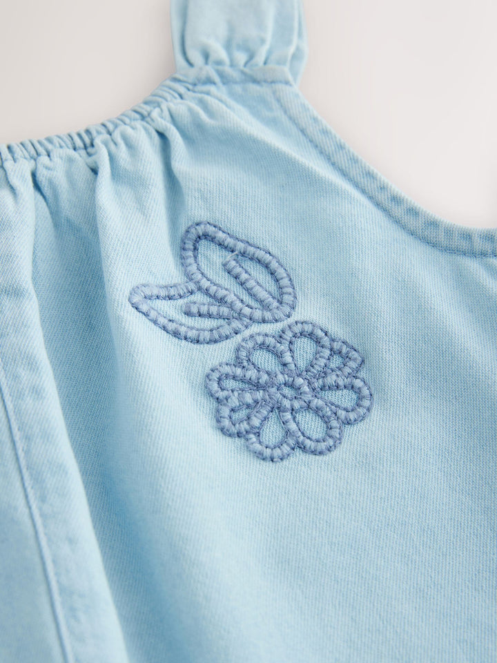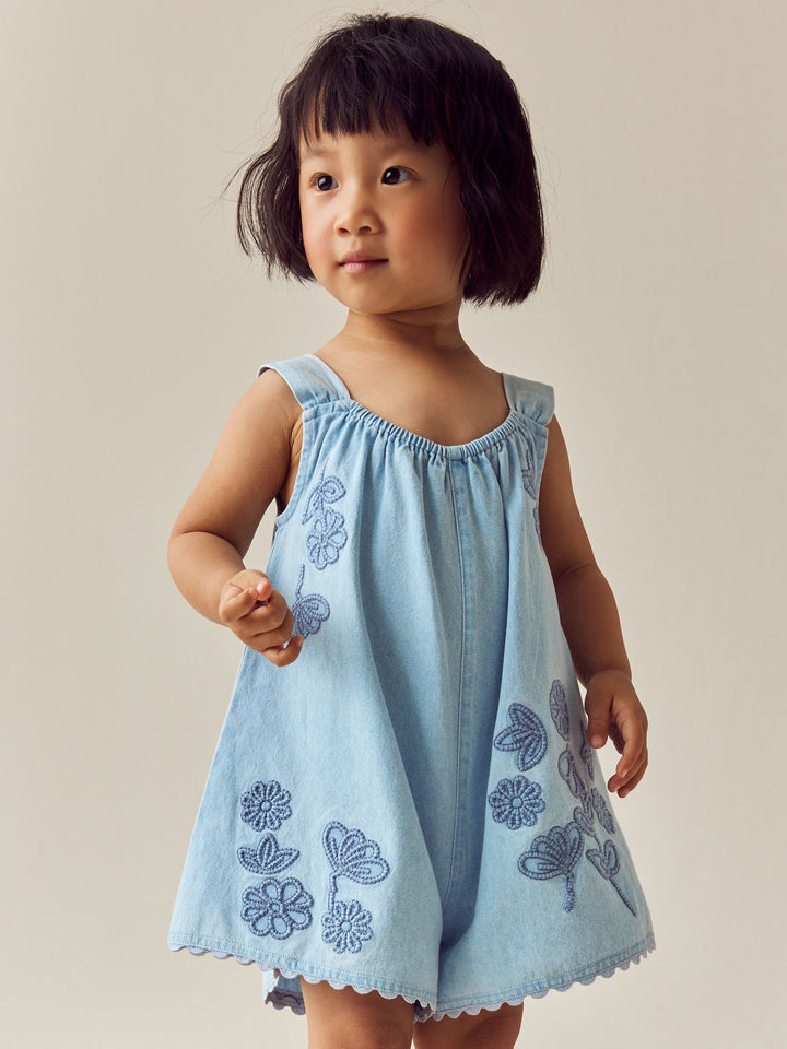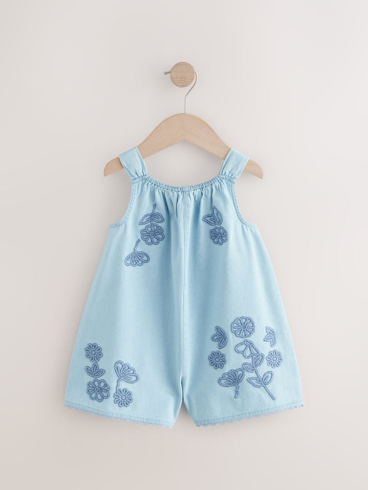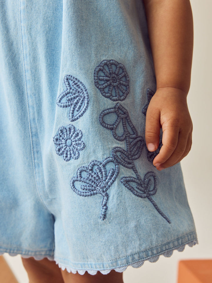 Denim 100% Cotton Flower Embroidered Playsuit (3mths-7yrs)