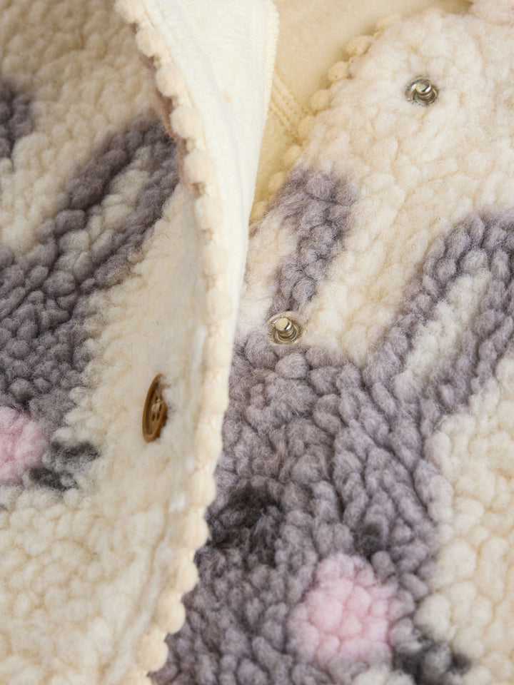 Keep your little one cosy in this charming borg hooded jacket in ecru and pink. The soft, textured borg fabric and all-over bunny print provide a comfortable and adorable look. The popper-front placket and hood with cute ear details ensure a snug fit for cooler days. Borg Bunny all-over print Hooded shape Button-front placket Main 100% Recycled polyester. Hood Lining 100% Recycled polyester. Country of Origin: China Warning: Keep away from fire and flames.