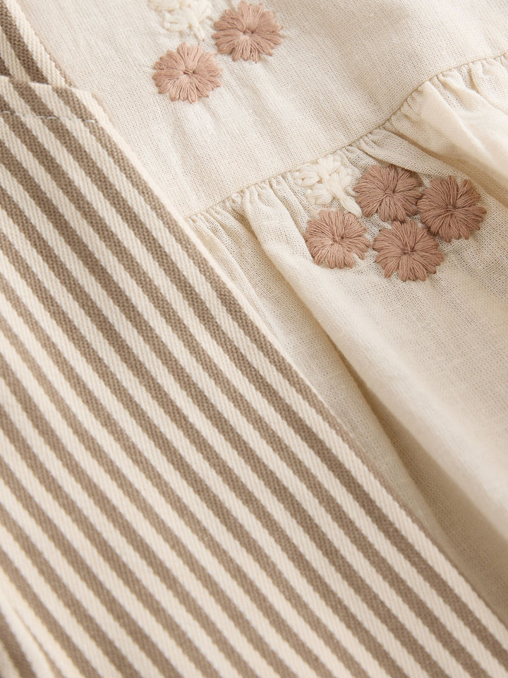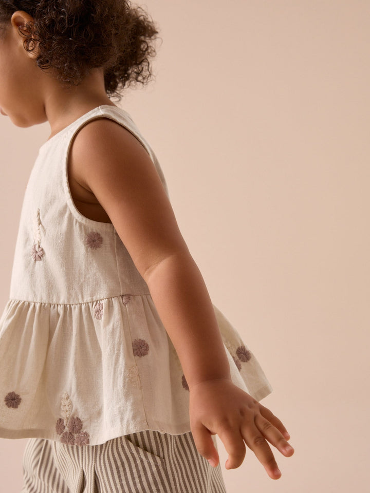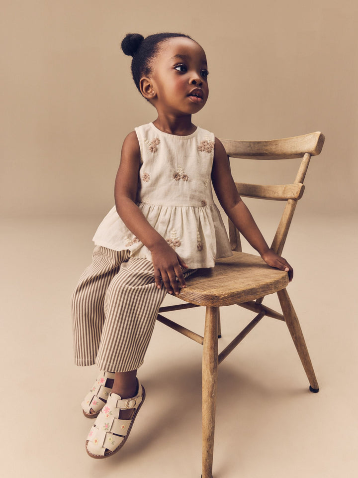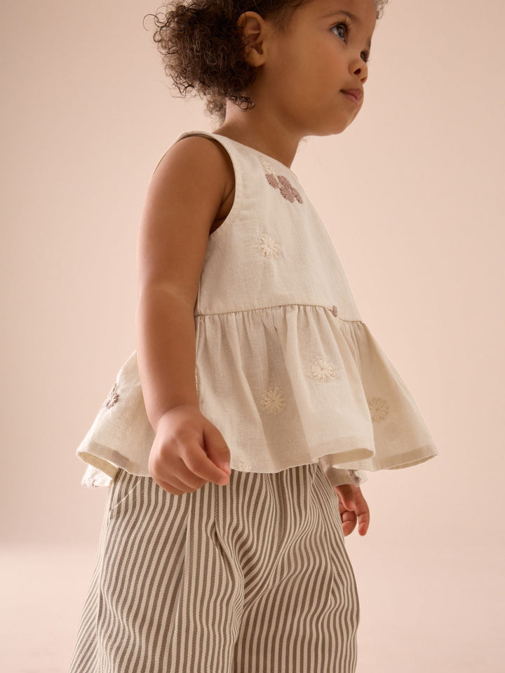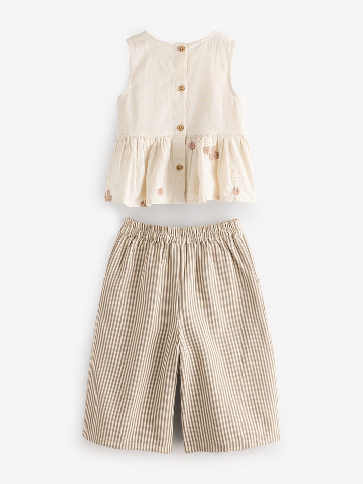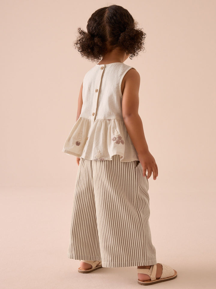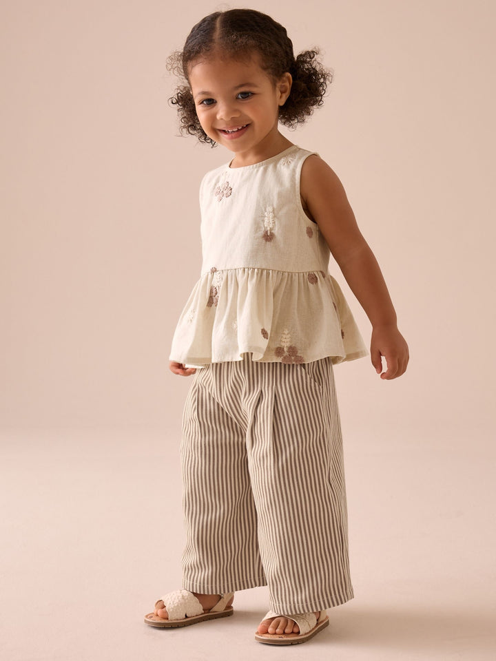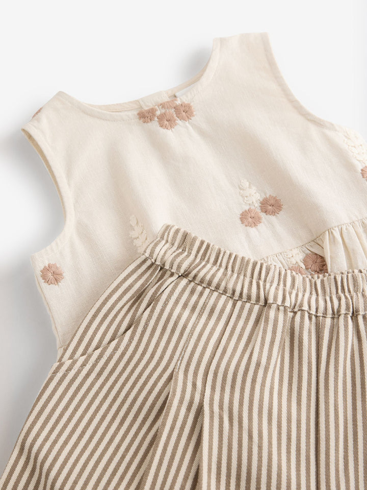 Perfect for summer days, this embroidered blouse and trousers set is a dreamy duo for your little girl. Featuring a sleeveless top and pull-on trousers, this gorgeous set features a tonal embroidered design on the blouse and stripes on the bottoms. 2 piece set Cotton rich blend Embroidered design Pull-on trousers Pockets Blouse Main 70% Cotton, 30% Linen. Lining 100% Cotton. Trouser 100% Cotton. Country of Origin: India