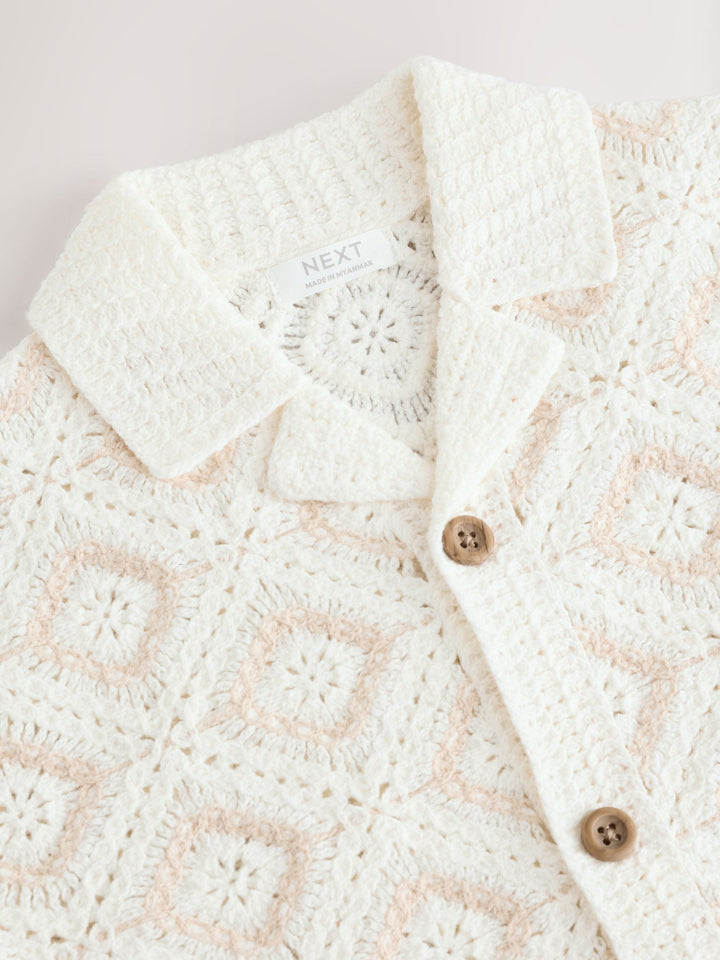 Made from a soft cotton blend, this ecru white short sleeve polo shirt has a crocheted knitted design with a button-down placket, finished with a revere collar. Cotton-blend Short sleeve Button-down fastening Crochet knit Revere collar 60% Cotton, 40% Acrylic. Country of Origin: Myanmar