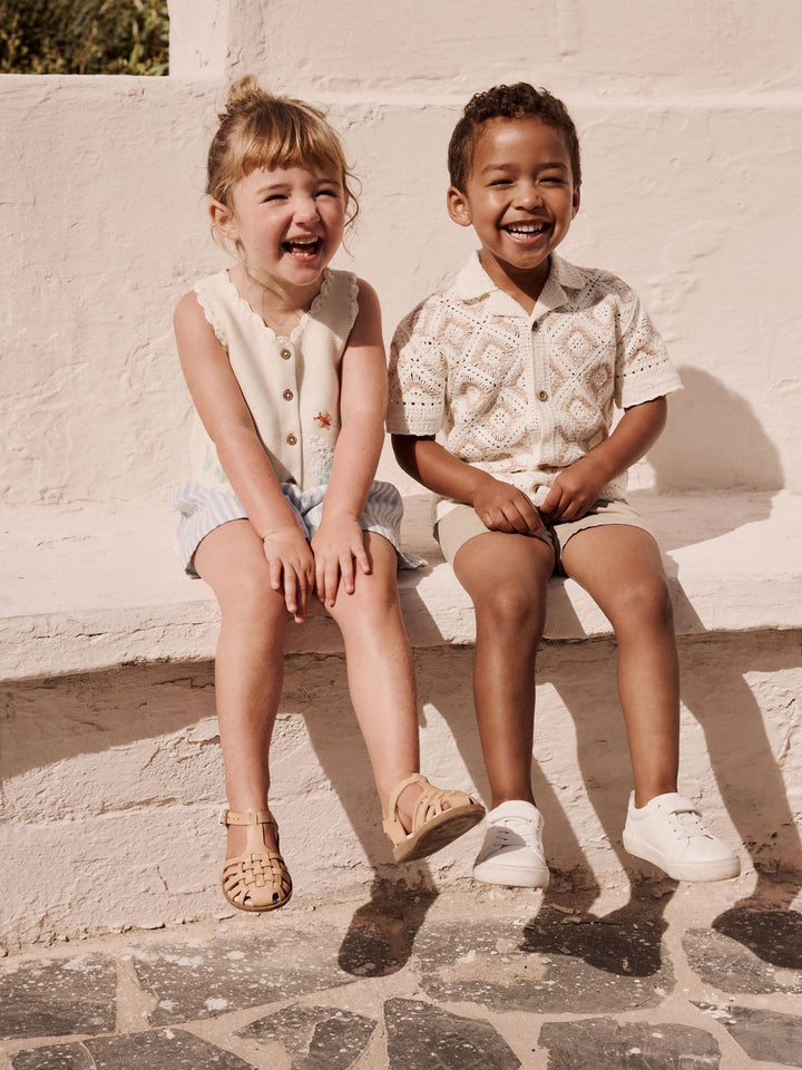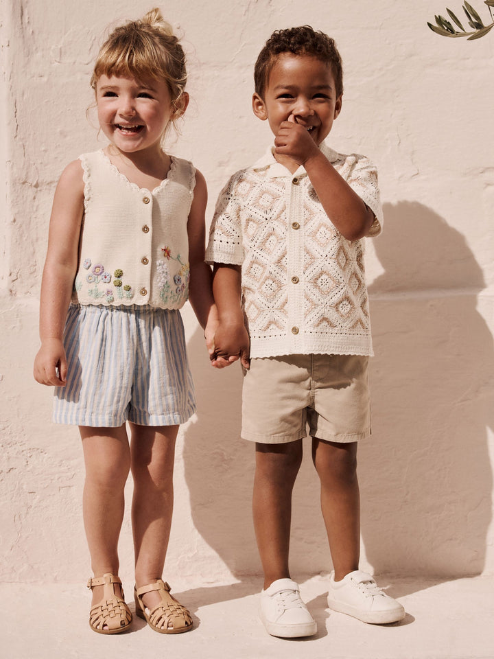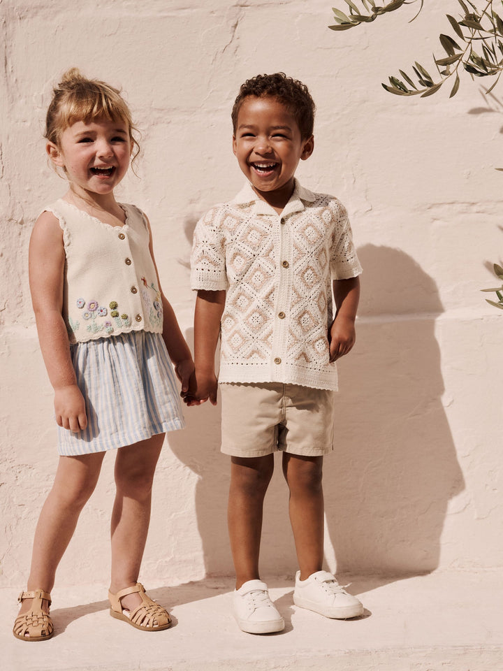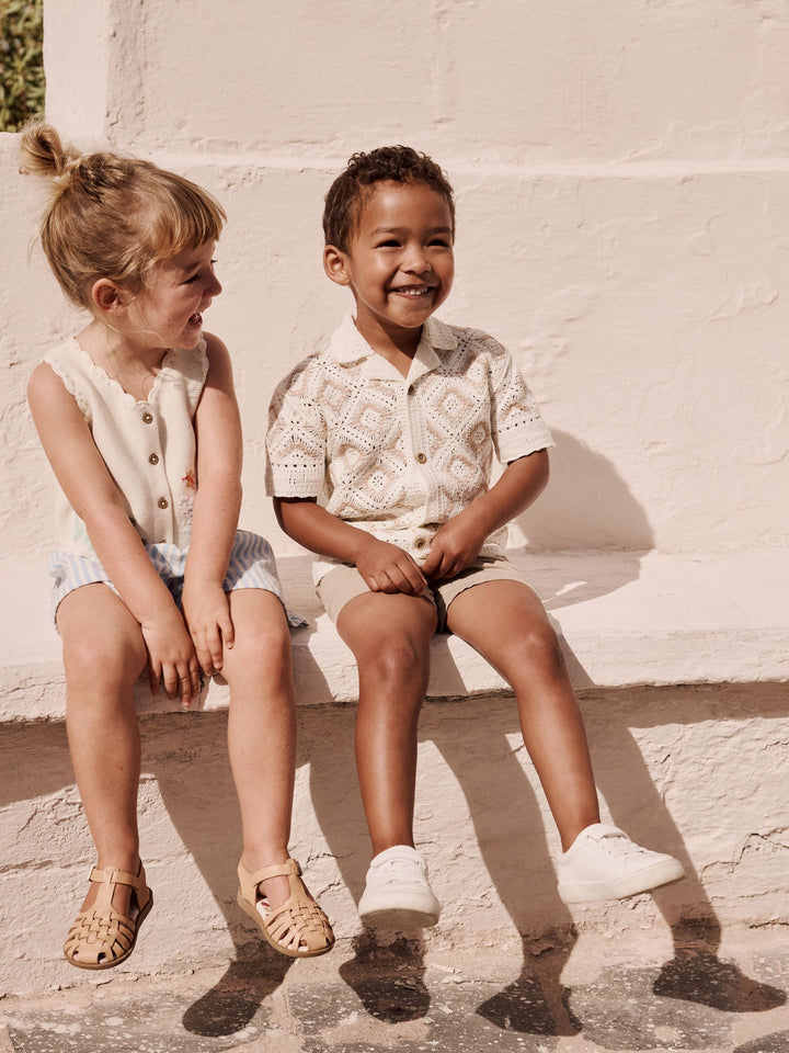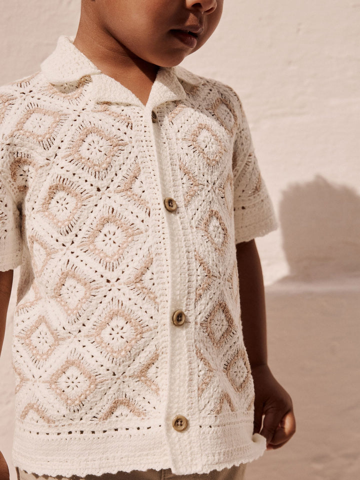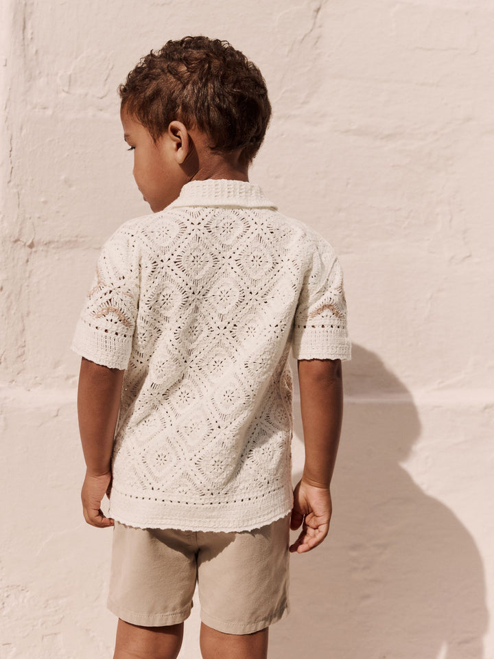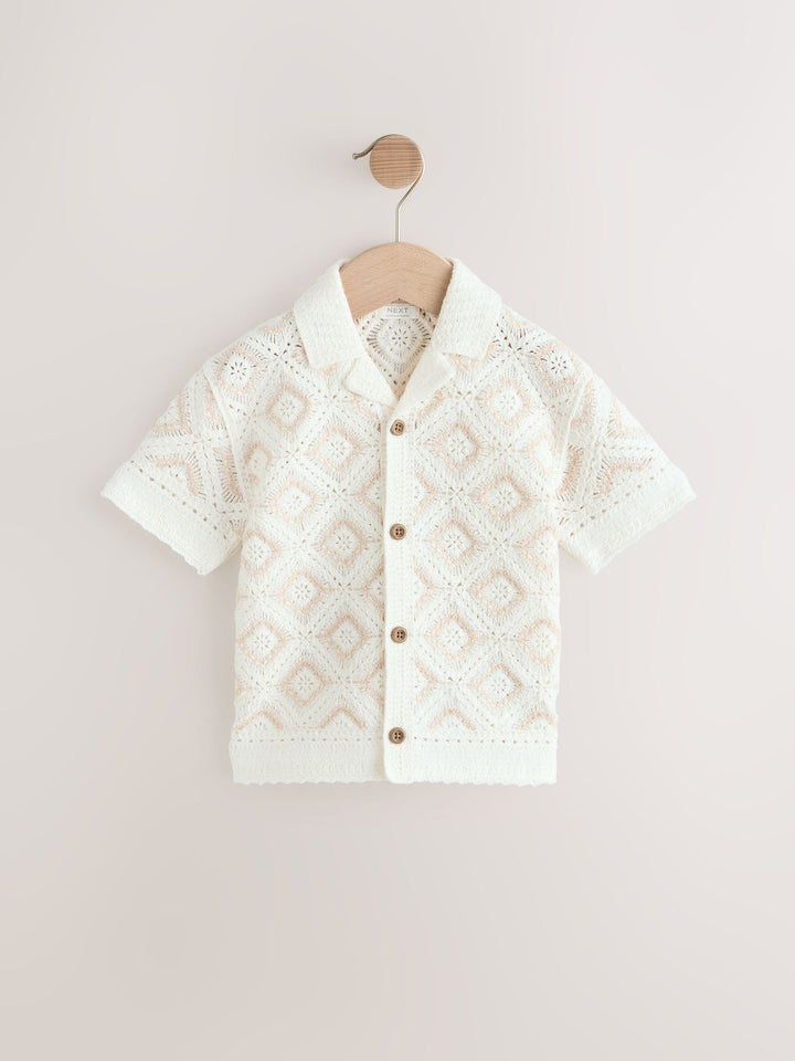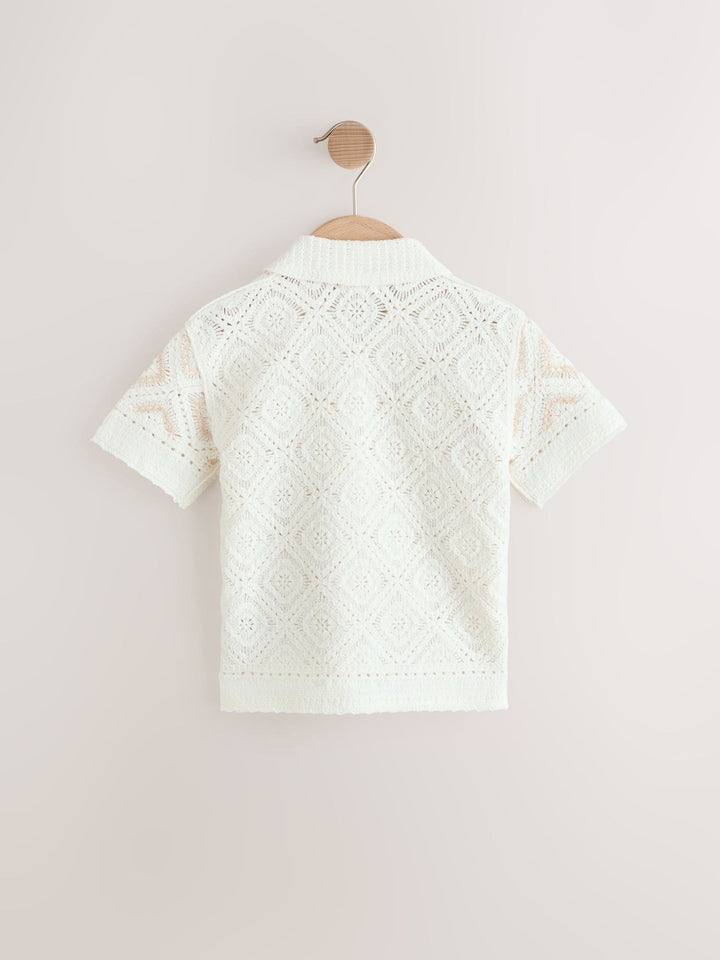 Ecru White Crochet Revere Collar Short Sleeve Knitted Polo Shirt (12mths-7yrs)